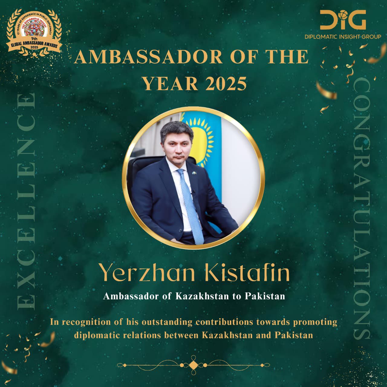 Islamabad, 26 November 2025 – The capital of Pakistan hosted the 7th annual «Global Ambassador Awards» ceremony, recognizing the achievements of heads of diplomatic missions, offices of international organizations, and representatives of the business community for the year 2025.The event was organized by Pakistan’s reputable magazine “The Diplomatic Insight” (Diplomatic Insight Group, DIG) in collaboration with the Institute of Peace and Diplomatic Studies.Among the distinguished guests were H.E. Mr. Murtaza Solangi, Spokesperson to the President of Pakistan, and H.E. Mr. Huzaifa Rehman, Minister of State for National Heritage and Culture and Special Assistant to the Prime Minister.This year, a special category “Ambassador of the Year” was introduced for the first time. To identify the nominees, comprehensive surveys were conducted among representatives of Pakistan’s political, official, diplomatic, business, and academic circles.Based on the results of these assessments, the title “Ambassador of the Year” was awarded to H.E. Yerzhan Kistafin, Ambassador of the Republic of Kazakhstan to Pakistan, in recognition of his substantial contribution to strengthening cooperation between Kazakhstan and Pakistan.It is noteworthy that the diplomatic corps in Islamabad comprises more than 120 diplomatic missions and offices of international organizations. Among all heads of diplomatic missions, the Ambassador of Kazakhstan was the sole recipient of this award in 2025.Earlier, in 2022, Ambassador Yerzhan Kistafin had already been honored with the «Global Ambassador Awards», underscoring the high recognition of the work carried out by the Embassy of the Republic of Kazakhstan in the Islamic Republic of Pakistan.Ambassador Yerzhan Kistafin expressed his gratitude to Mr. Muhammad Asif Noor, Head of the Diplomatic Insight Group, and Dr. Farhat Asif, Director of the Institute of Peace and Diplomatic Studies, for their high appreciation of the Embassy’s work.Source : https://www.gov.kz/memleket/entities/mfa-islamabad/press/news/details/1113823?lang=kk