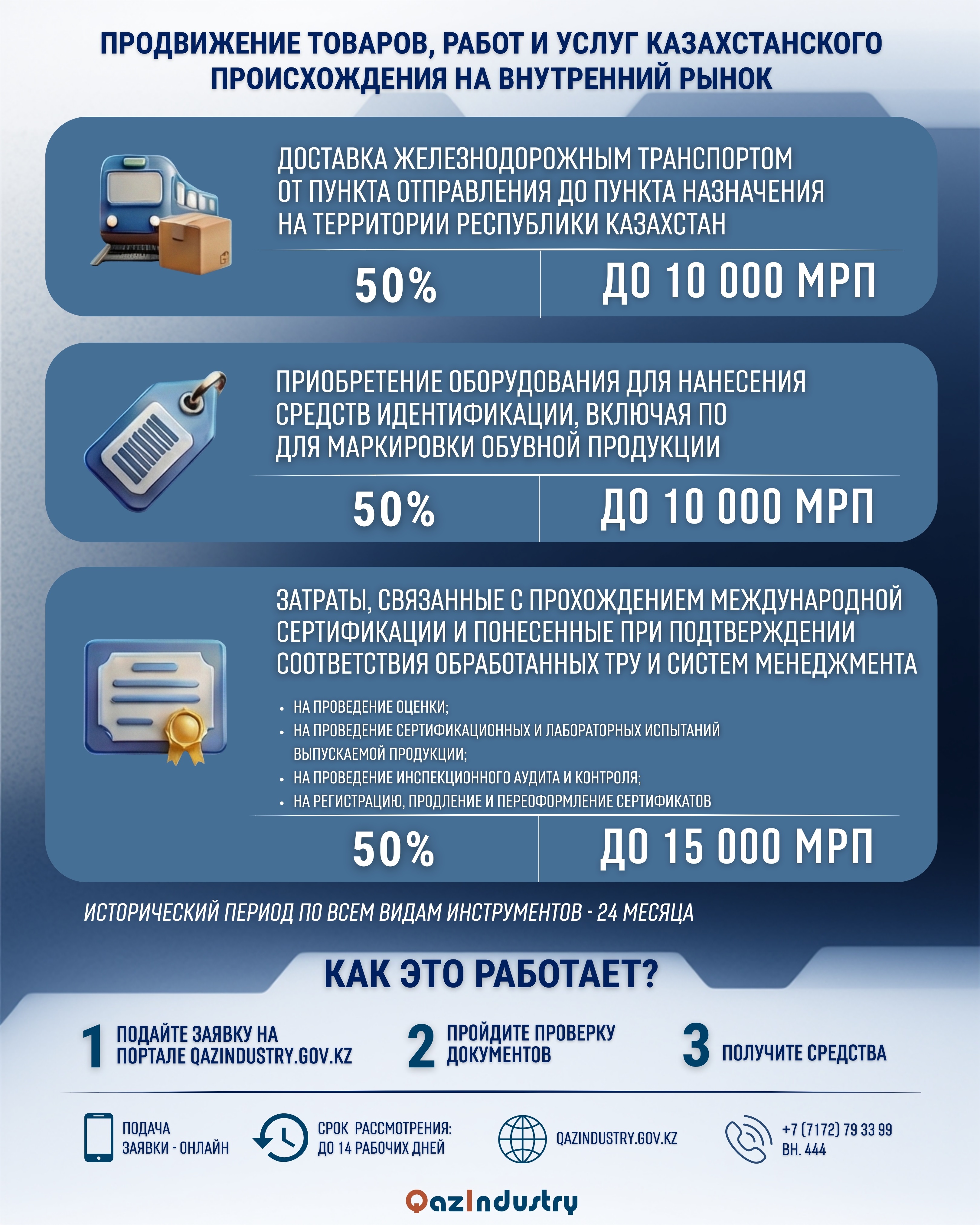 As part of the implementation of the instructions of the head of state to increase the competitiveness of the national economy, updated mechanisms of State stimulation of industry have been introduced. The incentive measures implemented by the Ministry of Industry and construction of the Republic of Kazakhstan are aimed at the development of the manufacturing industry.According to the amendments made to the" rules for the provision of state incentives for industry aimed at promoting processed goods, works and services produced in Kazakhstan to the domestic market", domestic enterprises can reimburse up to 50% of the cost of transporting priority goods by rail within the country. The maximum amount of compensation is 10 thousand MCI, that is, 43.25 million tenge. This measure is aimed at reducing the transport costs of manufacturers, increasing the competitiveness of Kazakhstani products and stimulating an increase in the share of domestic content. Also, for companies that plan to work with multinational corporations, the amount of reimbursement of costs for International Certification has increased fivefold. Such certificates make it possible to participate in tenders of large international organizations and expand export opportunities. The amount of compensation was increased from 3,000 MCI to 15,000 MCI. In addition, amendments were made to the" rules for providing state incentives for industry aimed at increasing labor productivity of subjects of industrial and innovative activity". Now the condition for increasing annual tax revenues does not apply to enterprises registered less than seven years ago (previously – three years). This change will allow taking into account the timing of production enterprises to reach full capacity and newly created companies to receive more state support. JSC" Kazakhstan Center for industry and export" QazIndustry". it is the national operator for the implementation of state incentives for industry. The center reimburses part of the costs of processing industry enterprises in the areas of increasing labor productivity and promoting products to the domestic market. In particular, enterprises can reimburse up to 40% of their costs for the purchase of technological equipment and the introduction of digital solutions, improving the competence of employees and the efficiency of production Organization, Certification, evaluation and testing of products, as well as the purchase of identification tools, including shoe marking equipment.Applications https://qazindustry.gov.kz/kk the portal is accepted online.Detailed information on business incentive measures https://qazindustry.gov.kz/kk posted on the official website (section"business incentives"). Every Tuesday and Thursday at the QazIndustry office (Astana, Kabanbai batyr Ave., 17, Block E). Open days are held. For advice, you can call +7 (7172) 79 33 99 (ext.444).Qazindustry on social networks:🔘Telegram: https://t.me/qaz_industry 🔘Facebook: https://www.facebook.com/QazIndustry 🔘Instagram: https://www.instagram.com/qazindustry/Source : https://www.gov.kz/memleket/entities/kostanai-mendykarin-audany-akimat/press/news/details/1166445?lang=kk