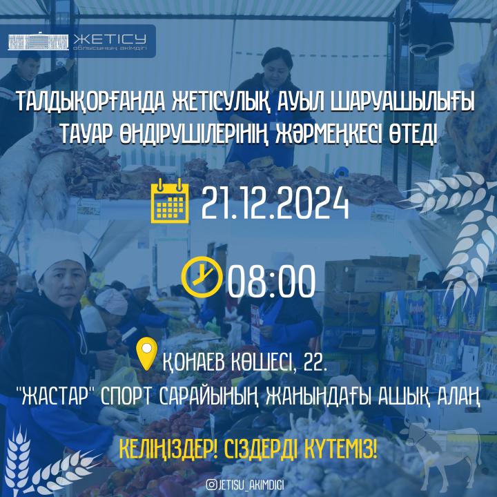 On the initiative of the Department of Agriculture of the Zhetisu region, an agricultural fair of producers of the region will be held in the city of Taldykorgan on December 21, 2024.Venue and time: Taldykorgan, Konaeva Street, 22, Zhastar Sports Palace, starting at 8.00.Source : https://www.gov.kz/memleket/entities/zhetysu-oblysy/press/news/details/906331
