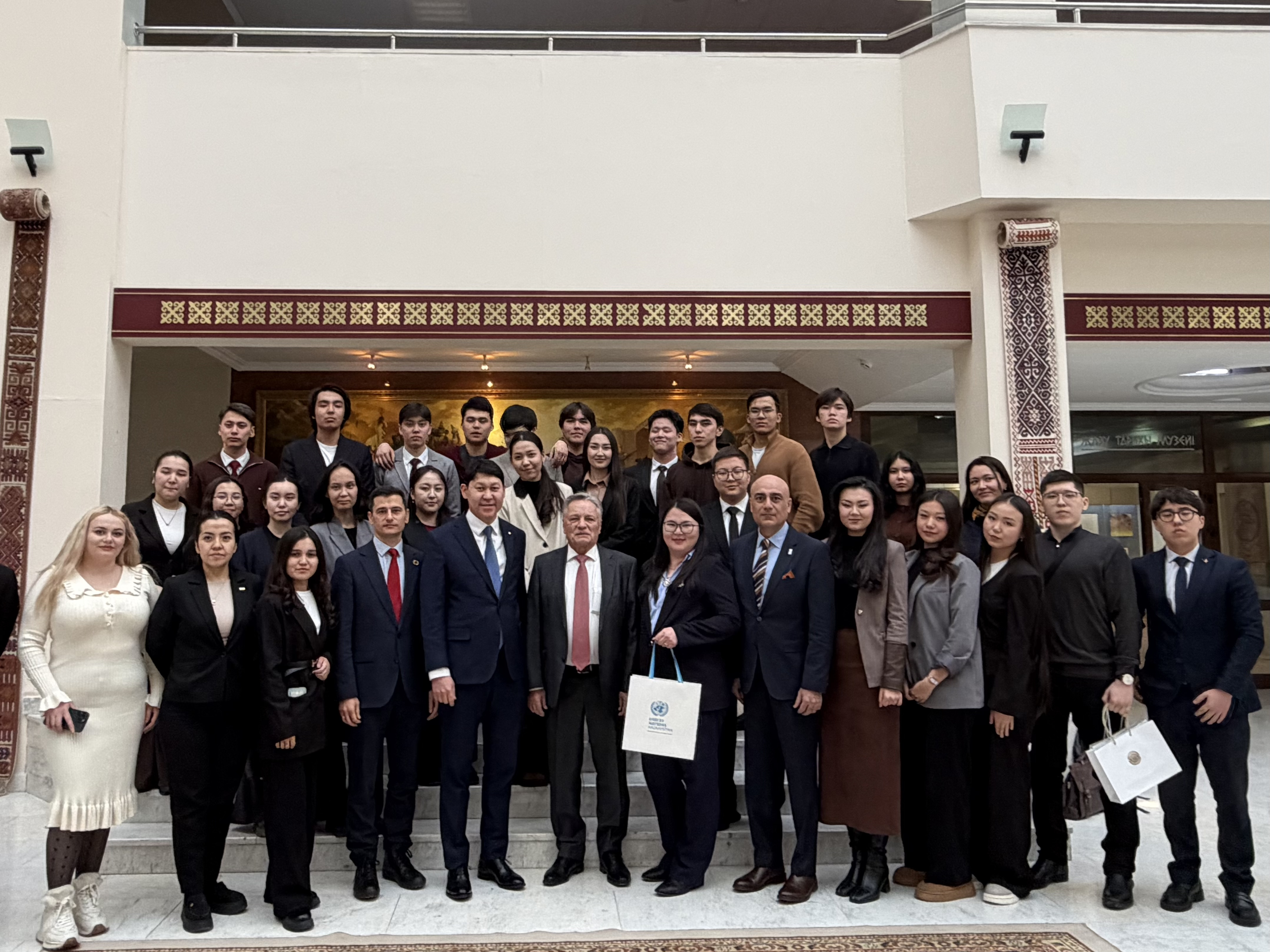 A capital city university hosted an open lecture today focusing on the priority areas of cooperation between Kazakhstan and the United Nations.Ministry of Foreign Affairs of the Republic of Kazakhstan, L.N. Gumilyov Eurasian National University, with the support of the United Nations Country Office, organized the event to mark the 34th anniversary of Kazakhstan’s membership in the United Nations. Students, faculty members, and young professionals attended the meeting.Speakers addressed key aspects of multilateral cooperation between Kazakhstan and the United Nations, the implementation of international initiatives, and the country’s contribution to strengthening peace and security. They also highlighted progress in achieving the Sustainable Development Goals and reviewed the work of UN agencies in Kazakhstan.Director of the Department of Multilateral Cooperation at the Ministry of Foreign Affairs, D.Temenov, outlined Kazakhstan’s leading role in promoting regional interests within the UN framework and presented the country’s priorities within the organization. He also emphasized the important role of the Eurasian National University in training specialists in international relations.K. Abdulganiyev, Head of the Office of the UN Resident Coordinator in Kazakhstan; S. Savelyev, Senior Expert at the Institute for Foreign Policy Research under the Ministry of Foreign Affairs of the Republic of Kazakhstan; and S. Khojimatov, Deputy Resident Representative of the United Nations Development Programme in Kazakhstan, shared insights into Kazakhstan’s efforts to achieve the Sustainable Development Goals and its contribution to the global nuclear disarmament process.The meeting served as an important educational and informational platform and aimed to increase students’ interest in international relations and diplomacy.Source : https://www.gov.kz/memleket/entities/mfa/press/news/details/1173775?lang=kk