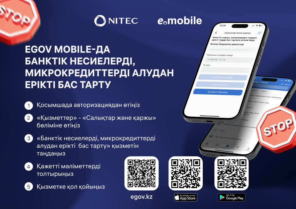 This service is available on the eGov portal.kz and in the mobile application "eGov mobile", which allows citizens to easily and quickly protect themselves from unwanted loans and fraudulent activities. The service is connected using an EDS. To connect, you need to select the "Services" section on the main page and then – "Voluntary refusal to receive bank loans and micro-loans".Source : https://www.gov.kz/memleket/entities/akimvko/press/news/details/868204