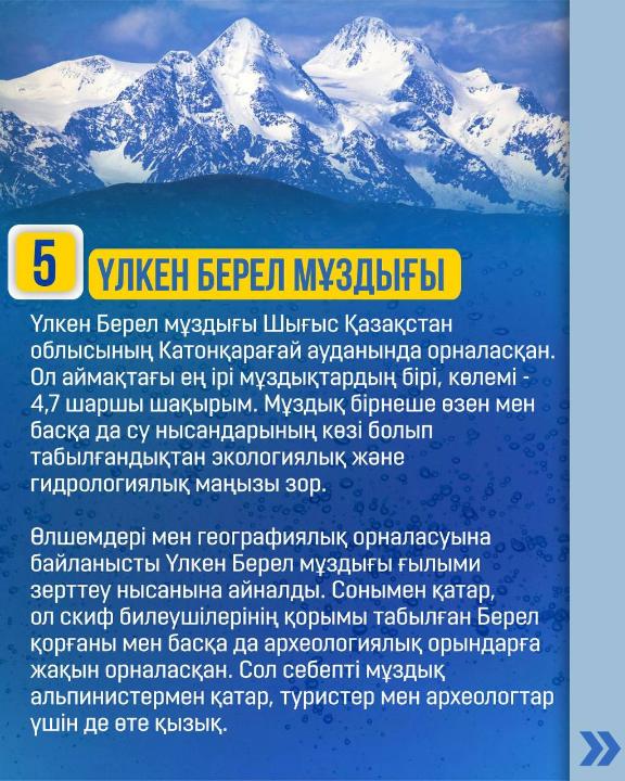 1. GLACIERS OF THE ILEI ALATAUThe majority of glaciers in Kazakhstan are located in the Ili Alatau. There are 470 glaciers with a total area of 140,732 square kilometers.Glaciers affect the state of rivers in the vicinity of Almaty, which is why they are of great ecological importance. In addition, the glaciers of the Ili Alatau are a very popular tourist destination among climbers and travelers.2. CONSTITUTION GLACIERThe Constitution Glacier is located in the south-east of Kazakhstan, in the Zhetysu Alatau (or eastern part of the Tien Shan). Its height is more than 4,500 meters.The glacier was named after the adoption of the Constitution of the Republic of Kazakhstan in 1993. It is the source of rivers in the region and has a great impact on nature. In addition, the glacier is located in a nature reserve, where rare species of plants and animals live.3. GLACIER OF THE MINING INSTITUTEThe Glacier of the Mining Institute is located on the northern slope of the Ili Alatau, east of Almaty. The glacier was studied by employees of the Mining Institute in Almaty, so it was named after the educational institution. It is considered the largest glacier in the Turgen River basin. Its area is about 3,786 square kilometers.The Glacier of the Mining Institute is an important natural area for climatic and geographical research. Its size and condition affect the ecosystem of the region, as well as the formation of rivers.4. SHOKALSKY GLACIERThe Shokalsky Glacier is the longest glacier located in the Talgar River basin. The total length is 3.52 kilometers. The glacier is named after the famous geographer and mountaineer Petr Shokalsky, who studied the mountainous and glacial regions of Central Asia.The Shokalsky glacier is a source of water resources for the rivers flowing through the Ili Alatau. It is also very important for climate research. Because the melting and changing of the glacier determines the climatic indicators of the region.5. BIG BEREL GLACIERThe Big Berel glacier is located in the Katonkaragay district of the East Kazakhstan region. It is one of the largest glaciers in the region, with an area of 4.7 square kilometers. The glacier is of great ecological and hydrological importance, as it is the source of several rivers and other water bodies.Due to its size and geographical location, the Big Berel glacier has become an object of scientific research. In addition, it is located near the Berel mound, where the burial grounds of Scythian rulers were found, and other archaeological sites. Therefore, the glacier is of great interest not only to climbers, but also to tourists and archaeologists.Source : https://www.gov.kz/memleket/entities/water/press/news/details/923770