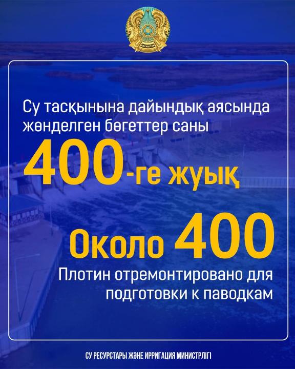 NUMBER OF DAYSNumber of dams repaired in flood preparednessnearly 400Source : https://www.gov.kz/memleket/entities/water/press/news/details/924968