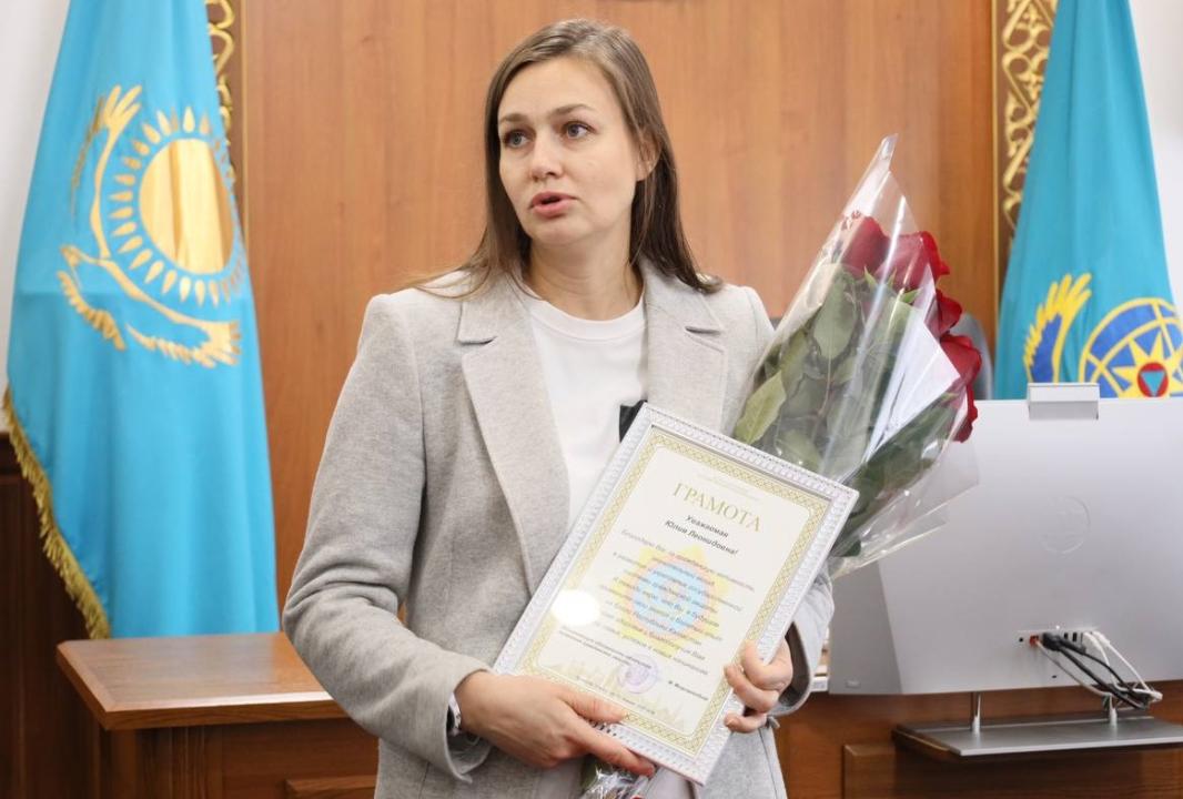 Taking into account her vigilance, responsibility and active civic position, Yulia Shimon was awarded a diploma by order of the Head of the Emergency Situations Department. The award was presented by Madiyar Myrzageldiev, Acting Head of the Emergency Situations Department of Astana.