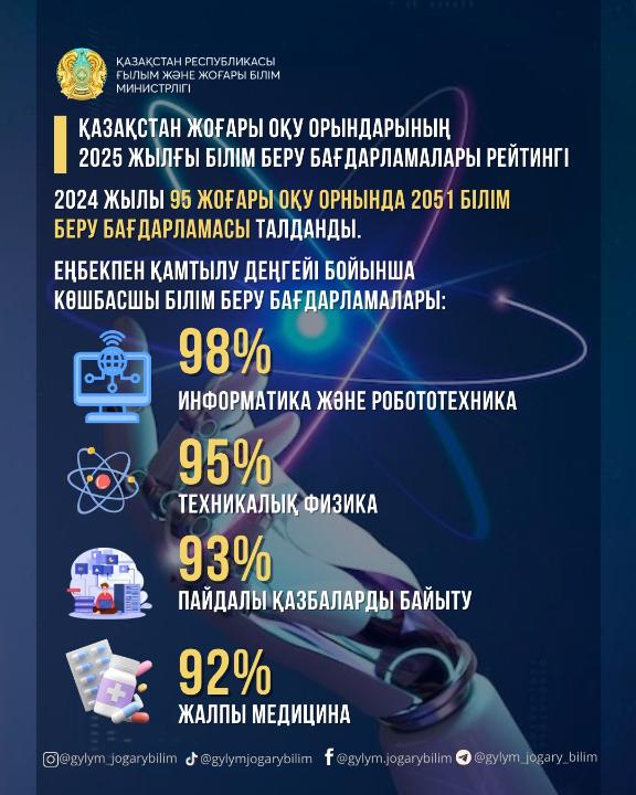 THE RESULTS OF THE RATING OF EDUCATIONAL PROGRAMS OF UNIVERSITIES OF KAZAKHSTAN FOR 2025 HAVE BEEN PUBLISHEDThe National Chamber of Entrepreneurs "Atameken" presented the results of the rating of educational programs of universities in Kazakhstan in 2025. This rating provides an objective assessment of the quality of educational programs and is the result of many years of work on the analysis and assessment of the quality of education in the country. This was announced by Azamat Beisenbenov, Managing Director of the Human Capital Development Department of the Atameken National Chamber of Entrepreneurs.The rating of educational programs is aimed at providing the key stakeholders – applicants, parents, employers and educational organizations – with useful and objective information. As part of the work on the rating, the following tasks were completed::Data collection for 2051 bachelor's degree educational programs;Involvement of independent industry experts;A comprehensive assessment of programs based on four sets of criteria: graduates' career prospects (49%); quality of educational programs (24%); student achievements (16%); general indicators of secondary vocational education (11%).In 2024, 2,051 educational programs in 95 universities were analyzed, for which 117 ratings were compiled. More than 100 experts from various industries from all regions of the country were involved in evaluating the content of educational programs. Basic statistics about graduates:The leaders in terms of employment among educational programs are:Computer Science and Robotics – 98%;Technical physics – 95%;Mineral processing – 93%;General medicine – 92%. Regional differences:Almaty region leads the way with an employment rate of 90%;East Kazakhstan region – 86% (VKTU and VKU);Kostanay region and North Kazakhstan region show an employment rate of 84%. The average duration of job search in 2024 was 3.3 months. The rating data of educational programs demonstrate both the achievements and growth areas of the higher education system in Kazakhstan, which allows us to build a strategy for further development of the industry. The rating of educational programs highlights the significant achievements of Kazakhstani universities in the field of education quality, but also identifies areas that require further attention and improvement.Source : https://www.gov.kz/memleket/entities/sci/press/news/details/922182
