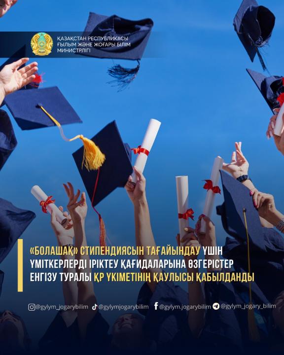 A RESOLUTION OF THE GOVERNMENT OF THE REPUBLIC OF KAZAKHSTAN ON AMENDMENTS TO THE RULES FOR THE SELECTION OF APPLICANTS FOR THE AWARD OF THE BOLASHAK SCHOLARSHIP HAS BEEN ADOPTEDOn January 17, 2025, the Resolution of the Government of the Republic of Kazakhstan "On Amendments to the Resolution of the Government of the Republic of Kazakhstan dated June 11, 2008 No. 573 "On Approval of the Rules for the Selection of Applicants for the Award of the Bolashak International Scholarship and the determination of the directions of expenditure of the Bolashak International Scholarship" was adopted, which approved new Rules for the selection of applicants for the award of the Bolashak International Scholarship.The resolution comes into effect ten calendar days after the date of its first official publication.The new rules for the selection of candidates for the Bolashak scholarship provide for the renewal of the competitive selection process with the introduction of a screening mechanism. So, according to this innovation, candidates who do not score the required number of points will not be allowed to the next round.In order to further improve the state apparatus, the category of "civil servants" is being introduced for training under the Master's degree program with the possibility of taking language courses.In addition, graduates of the program have the opportunity to complete work experience in international organizations of which the Republic of Kazakhstan is a member, such as the United Nations, UNESCO, SCO and TMT.The list of necessary documents for participation in the competitive selection has also been supplemented with a motivation letter. Candidates who have not passed the competitive selection process are granted the right to re-participate in the competition in the same calendar year.In general, these changes are aimed at improving the Bolashak International Scholarship and training qualified personnel for various sectors of the country's economy.Source : https://www.gov.kz/memleket/entities/sci/press/news/details/921096
