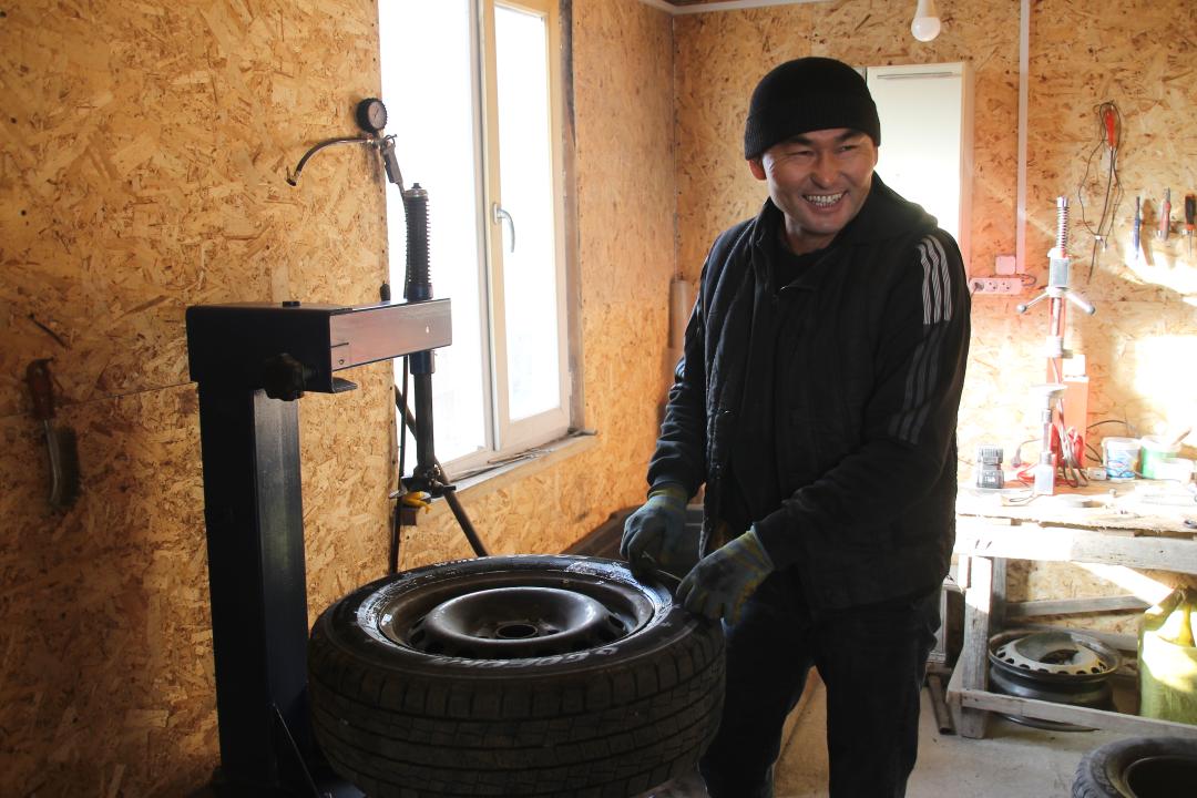 Being in a difficult life situation, a resident of Ushtobe, a father of five children, Bekzat Otezhanov, thought about opening his own tire repair center. The financial support provided by the state helped him to bring the idea to life: