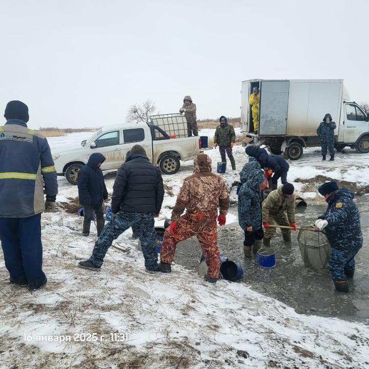 According to operational data, about 1.2 million juvenile fish were rescued on January 16. The rescued young crucian and carp with an average weight of 5-6 grams of fish are transported to the Zhaik River in a live form.