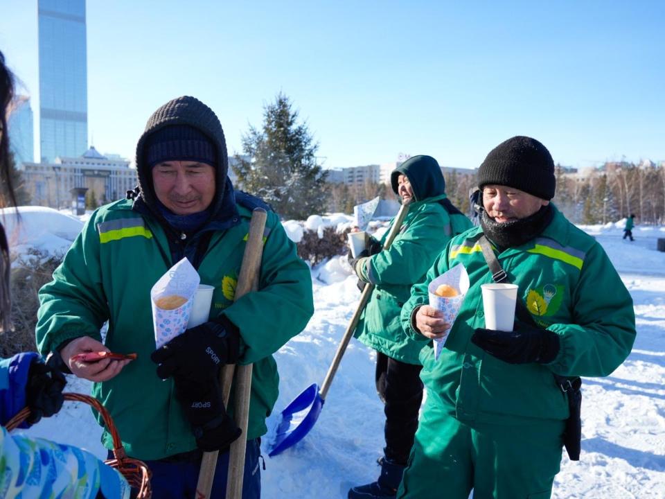 Volunteers in Astana distributed hot tea and baursak to utility workers on a frosty day