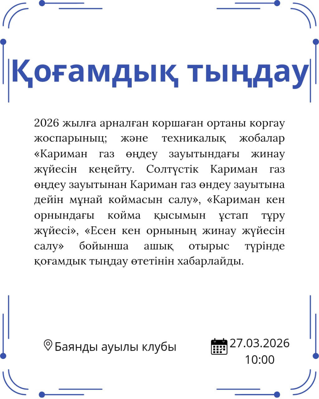 On March 27, 2026, at 15:00, the village club of Bayandy village will host public hearings on the project of Kentau Group LLP for mining expanded clay stone at the site of the quarry-5 deposit in the Munailinsky district.