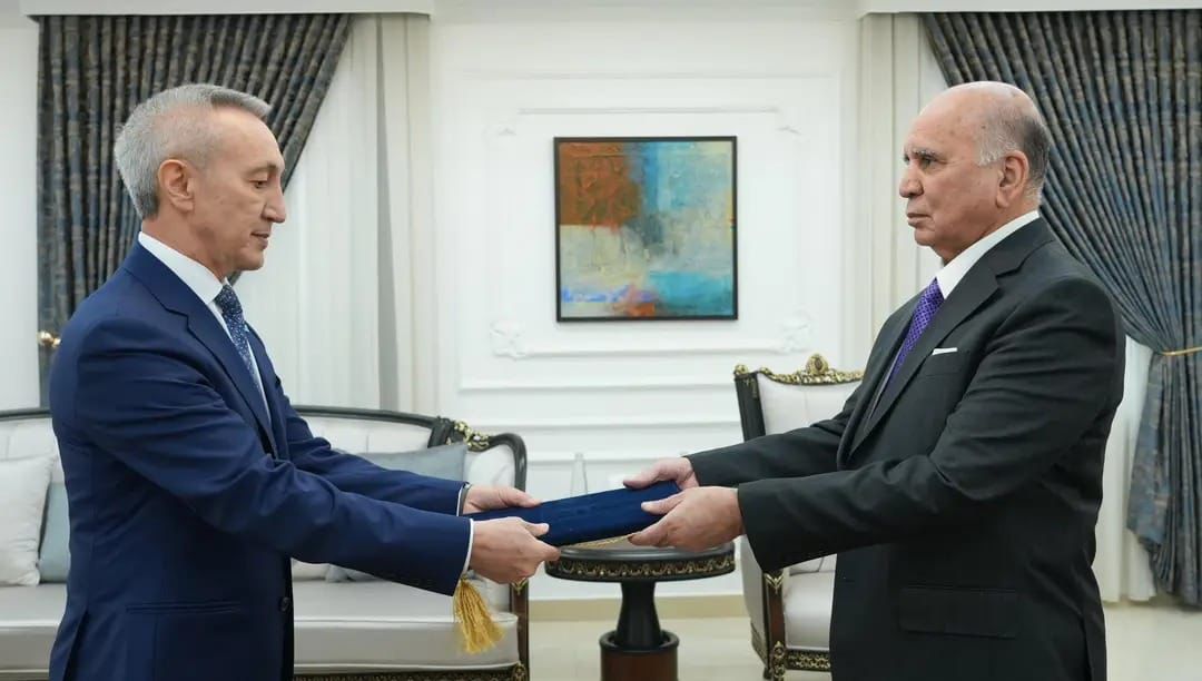 Baghdad, October 6, 2025. A ceremony was held at the Ministry of Foreign Affairs of the Republic of Iraq to present copies of his credentials from H.E. Mr.Talgat Shaldanbay, Ambassador Extraordinary and Plenipotentiary of the Republic of Kazakhstan to the Republic of Iraq, residing in Amman (Hashemite Kingdom of Jordan), to H.E. Mr.Fuad Hussein, Deputy Prime Minister and Minister of Foreign Affairs of Iraq.