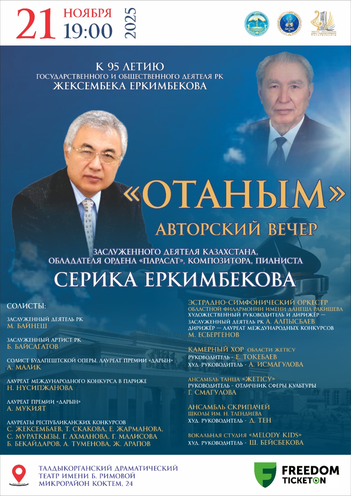 We invite you to the evening of poetry "Otanym" by Honored Worker of the Republic of Kazakhstan, composer, and pianist Serik Yerkimbekov, which will take place on November 21 at 7:00 PM. The evening is dedicated to the 95th anniversary of Zheksembek Yerkimbekov, a statesman and public figure of the Republic of Kazakhstan.