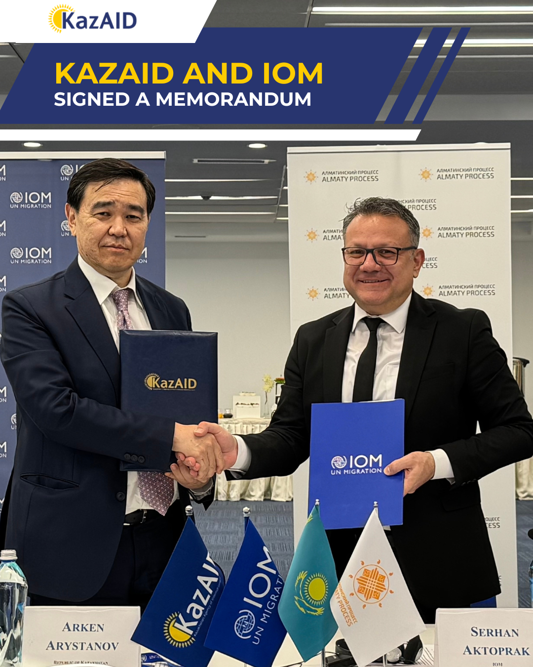 The document, aimed at strengthening institutional collaboration on migration data and supporting regional projects within the Almaty Process, was signed by Arken Arystanov, Chairman of the Board of KazAID, and Serhan Aktoprak, Head of IOM in Kazakhstan.