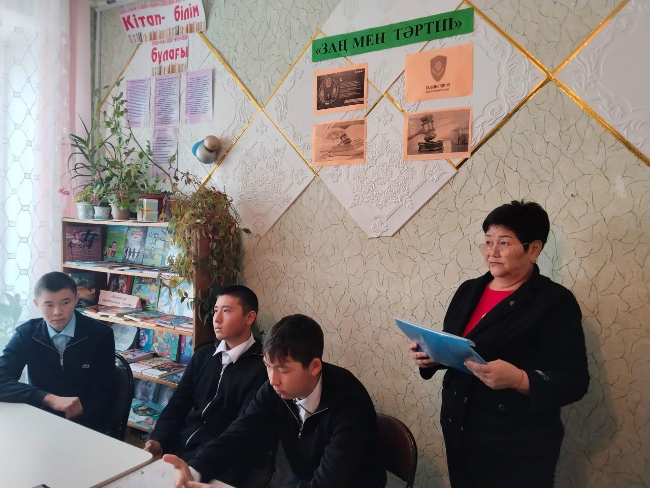 On December 5, as part of a meeting with 11th grade students of the Abai secondary school and senior police lieutenant Samar Tokushev O.K., a round table on "Law and Order" was held in the Bastaushinsky rural library, organized by the librarian and the head of the club, in order to improve legal literacy among young people and prevent offenses in society. During the meeting, issues of crime prevention, work with minors, and the formation of a legal culture among young people were discussed.