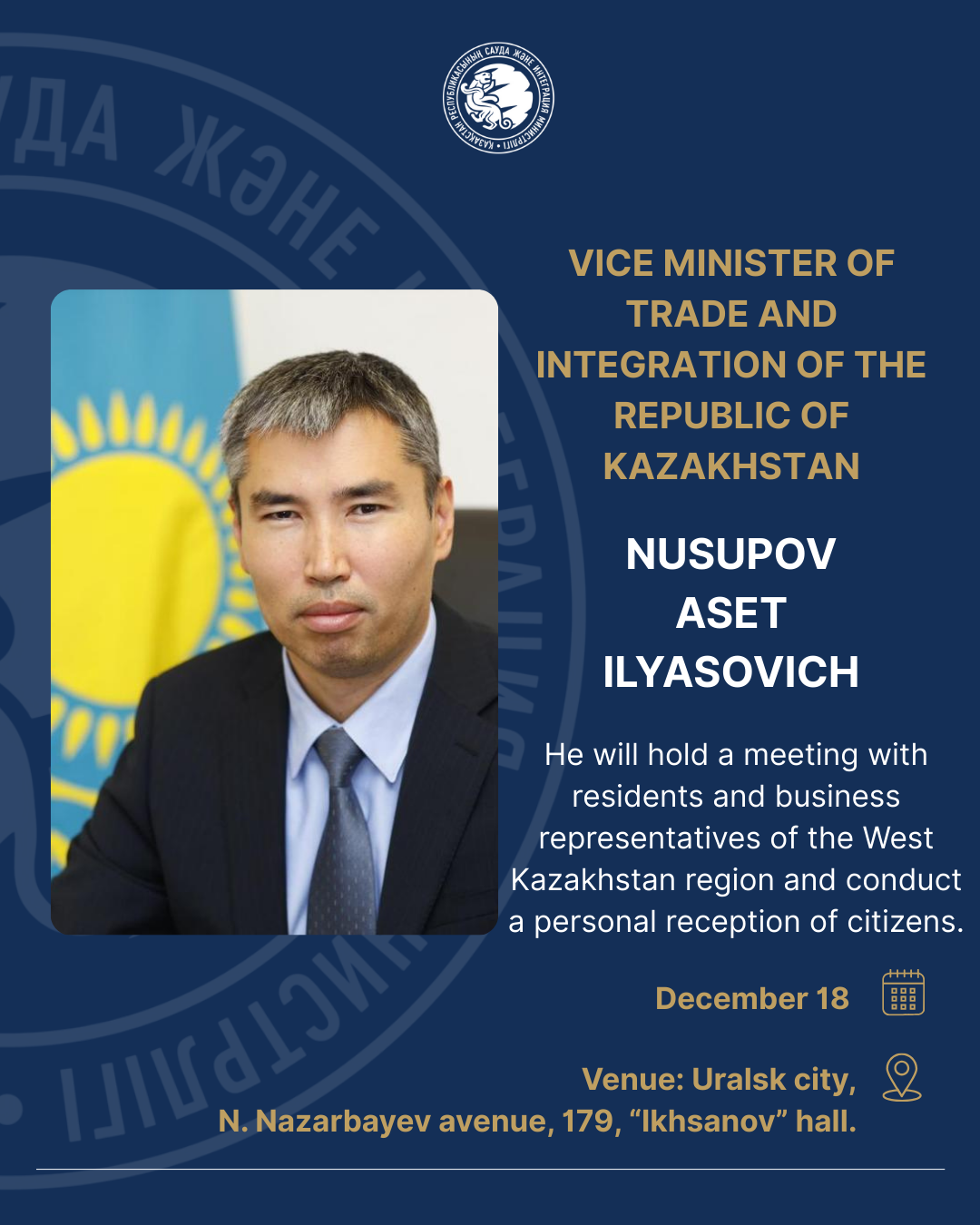 On December 18, 2025, Asset Nusupov, Vice Minister of Trade and Integration of the Republic of Kazakhstan, will hold a meeting with business representatives.