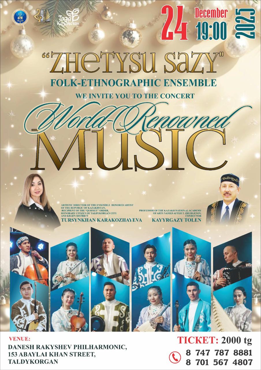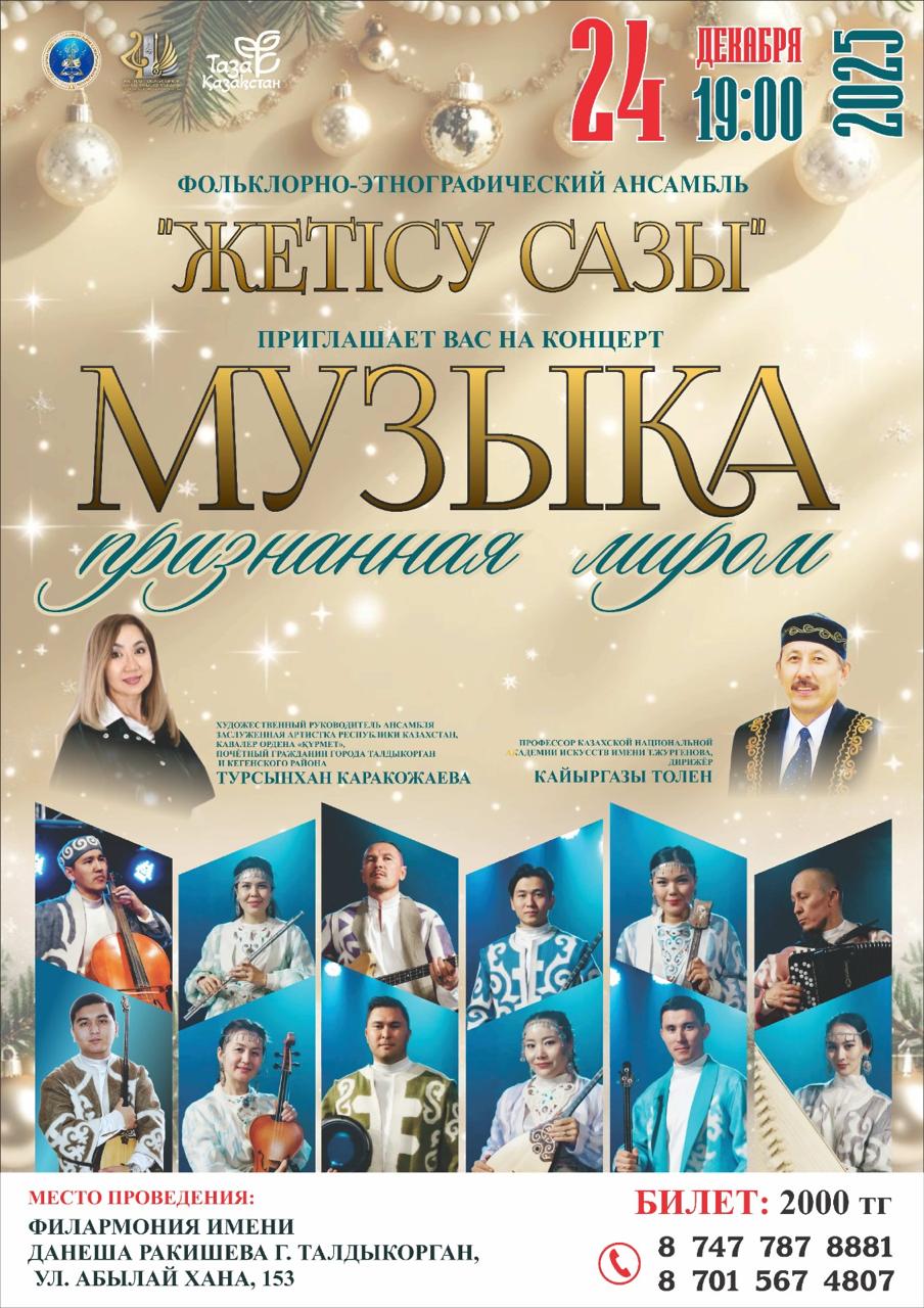 We warmly invite you to a wonderful concert by the folk-ethnographic ensemble "Zhetisu Sazy" titled "Music Recognized by the World", which will take place on December 24 at 19:00 in the concert hall of the Danesh Rakishev Philharmonic of Zhetisu Region.
