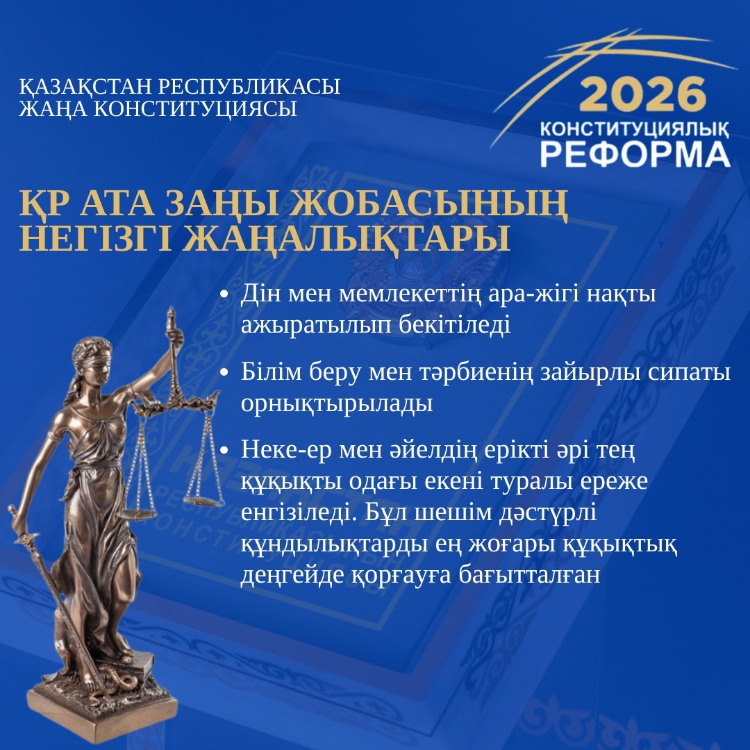 A number of important innovations of the new draft Constitution of the Republic of Kazakhstan were presented as part of the constitutional reform planned for 2026. The draft Constitution clearly establishes the secular nature of the state and clearly separates religion from the state.