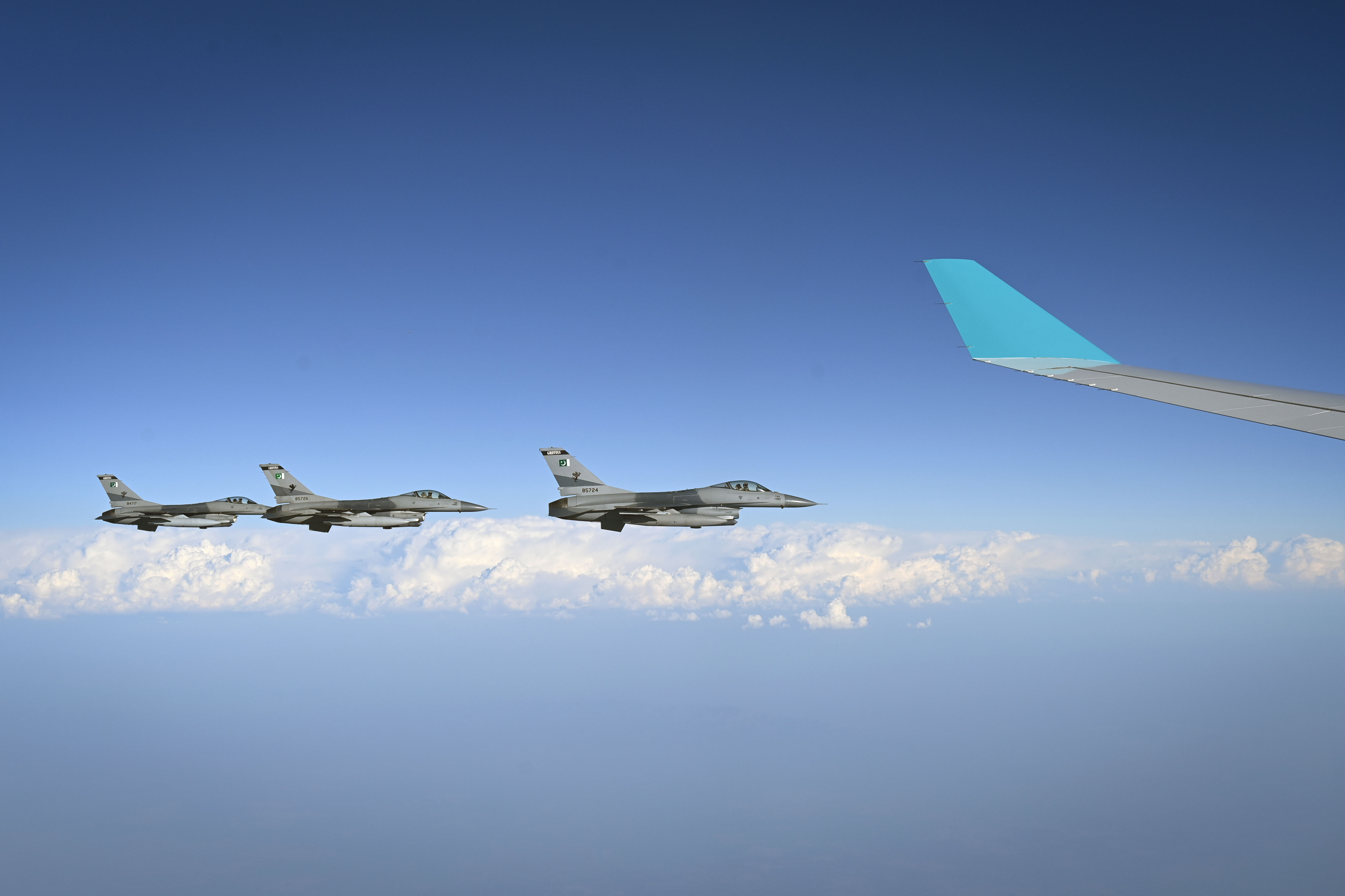 His aircraft was escorted by fighter jets of the Pakistan Air Force.