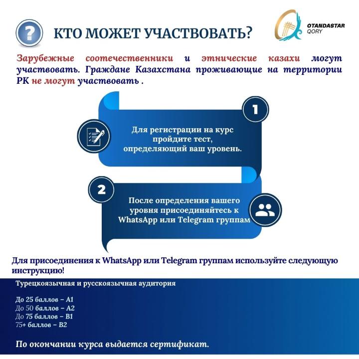 Once you join the WhatsApp group, please wait for the instructor’s guidelines. The instructor will send the schedule after all participants complete the placement test. The online Kazakh language course is scheduled to begin in March 2026.
