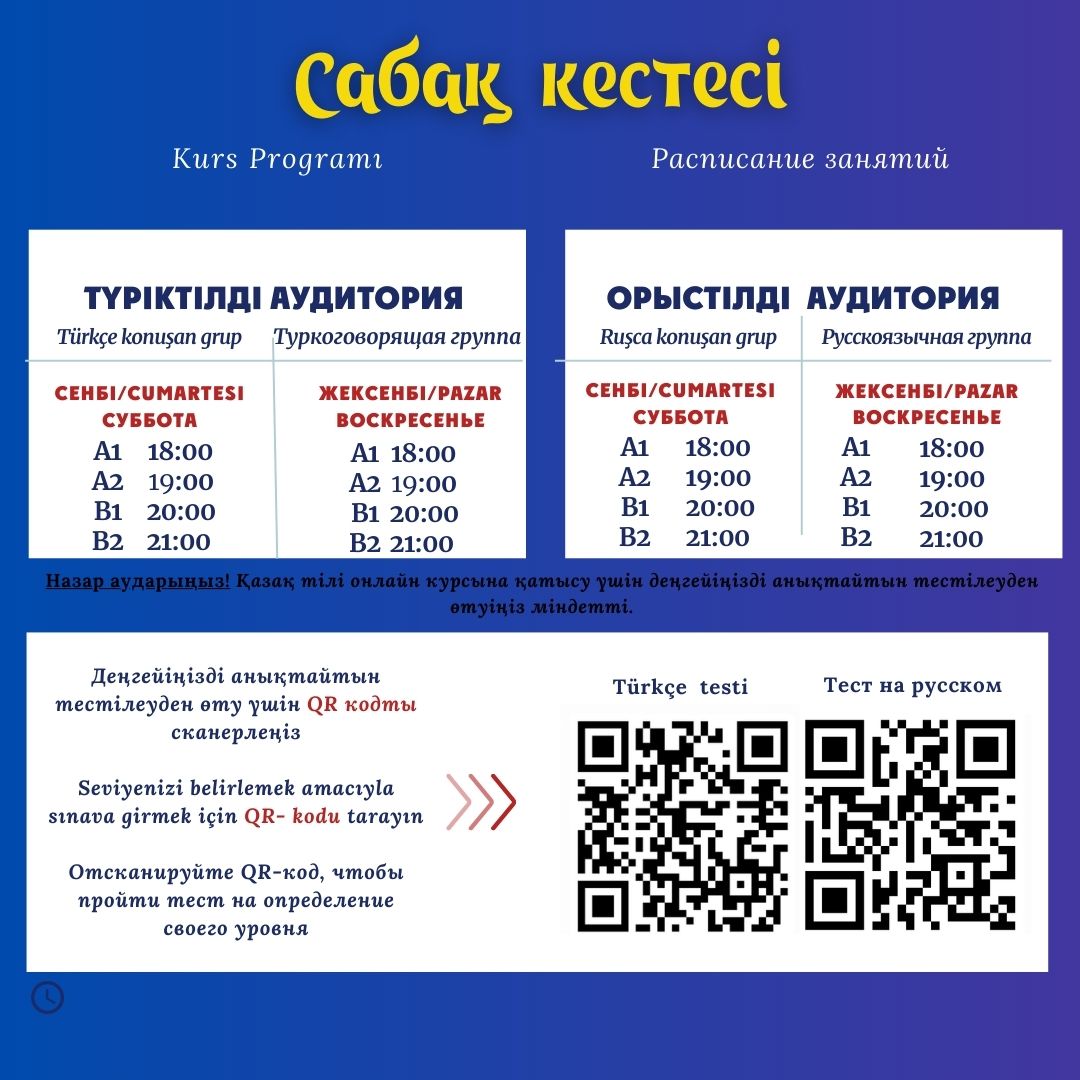 Once you join the WhatsApp group, please wait for the instructor’s guidelines. The instructor will send the schedule after all participants complete the placement test. The online Kazakh language course is scheduled to begin in March 2026.