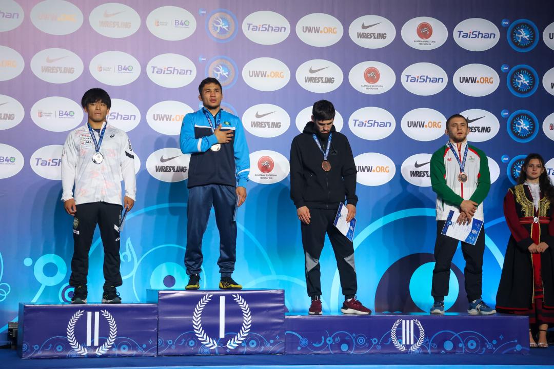 Which of the Kazakhstani wrestlers won medals in this weight category?