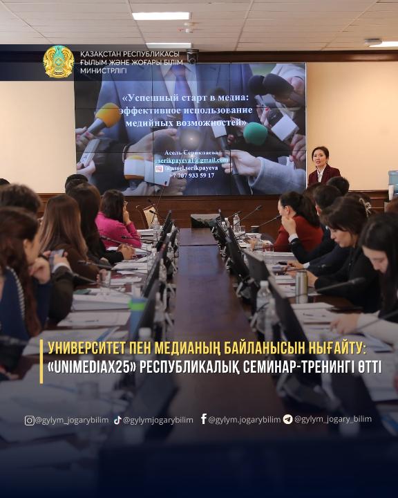 The Ministry of Science and Higher Education of the Republic of Kazakhstan and the L.N. Gumilyov Eurasian National University organized a two-day republican seminar-training "UniMediaX25" for press secretaries in the field of science and higher education. The main goal of this event is to teach representatives of the press service in the field of science and education modern methods and approaches in the field of media and communication, exchange experience and improve their professional skills.