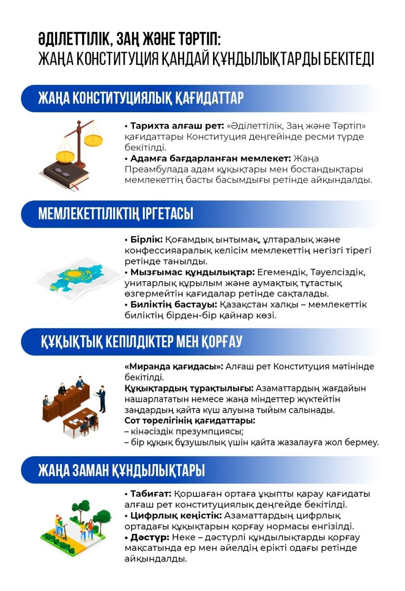 In the new Constitution of Kazakhstan, which will be adopted in 2026, for the first time in history, the principles of "Justice, Law and Order" have been officially enshrined at the Constitutional level. This is an important step towards raising the country's legal system to a new qualitative level and fully protecting the rights of citizens. The new Preamble clearly states that human rights and freedoms are the main priority of the state. According to this document, the main direction of state activity is to serve the citizen. The document recognizes social unity, interethnic and interfaith harmony as the main pillars ensuring the stability of the state. Also, sovereignty, independence, unitary structure and territorial integrity are enshrined in the Constitution as immutable, unshakable values. The source of power is the people of Kazakhstan, that is, the people are the only source of state power. The new Constitution for the first time enshrines the "Miranda Principle", and also provides for a number of guarantees aimed at protecting the rights and interests of citizens: Laws cannot worsen the situation of citizens or impose new obligations. Principles of justice: presumption of innocence and prohibition of repeated punishment for the same offense. The document enshrined the principle of environmental and nature protection at the constitutional level. In addition, a norm was introduced to protect the rights of citizens in the digital space. Traditional values were also not ignored: marriage was defined as a voluntary union of a man and a woman. The new Constitution, combining the historical traditions of the country and modern requirements, determines the directions of legal, social and cultural development of Kazakhstan.