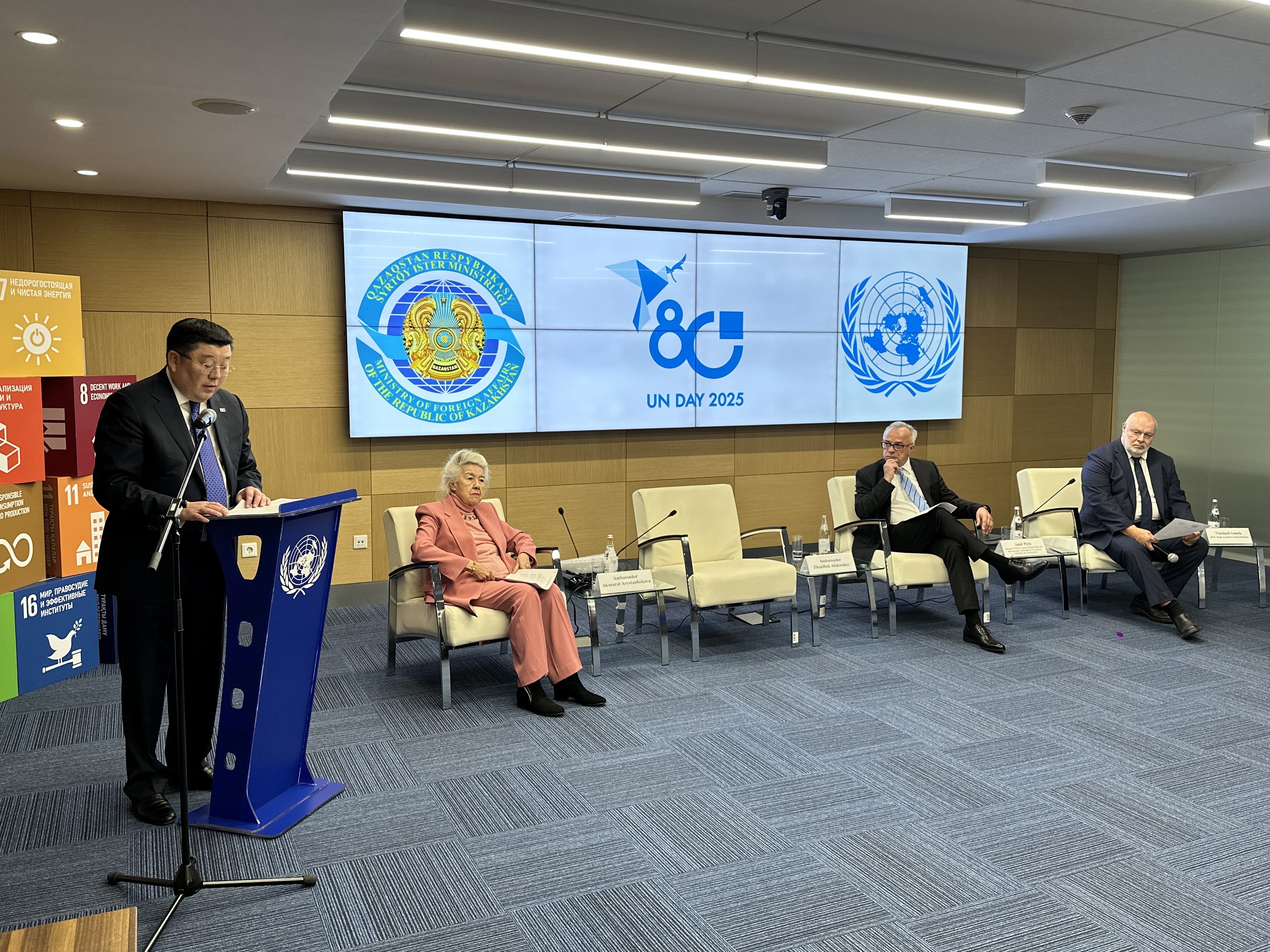 On 24 October 2025, at the “UN Plaza” building in Almaty an event dedicated to UN Day andthe 80th anniversary of the United Nations was held.The event is organized by the Representative office of the Ministry of Foreign Affairs of theRepublic of Kazakhstan in Almaty together with the Permanent Mission of the United Nations inKazakhstan.The event was attended by Ambassador-at-Large – Head of the Representative office of theMinistry of Foreign Affairs of the Republic of Kazakhstan in Almaty Zhanibek Abdrashov, formerMinister of Affairs of the Republic of Kazakhstan, First Permanent Representative ofKazakhstan to the United Nations Akmaral Arystanbekova, and the Director of the UnitedNations Regional Office for Education, Science and Culture for Kazakhstan, Kyrgyzstan andTajikistan (UNESCO), Amir Piric, as well as representatives of the diplomatic corps, UNagencies, academic circles and youth organisations.During the discussion participants addressed key issues of the international agenda that are inthe focus of the UN anniversary.In his speech Zh. Abdrashov emphasized Kazakhstan’s contribution to the development ofmultilateral diplomacy and commitment to the principles and goals of the United Nations. He also noted the initiatives of the Head of State, announced at the last session of the UN General Assembly, aimed at strengthening international peace, security, and sustainable development.Special attention was paid to the UN Regional Centre for the Sustainable Development Goalsfor Central Asia and Afghanistan in Almaty.Also, as part of the celebration of the UN anniversary, together with the Akimat of Almaty city,UN themed graphics were placed on the “Kok-Tobe” TV-tower.Source : https://www.gov.kz/memleket/entities/mfa-almaty/press/news/details/1092737?lang=kk