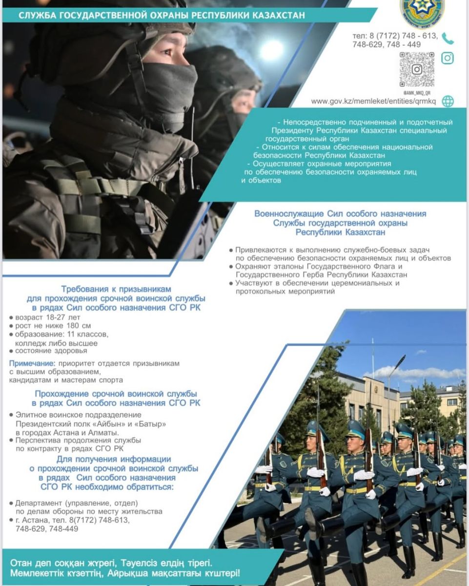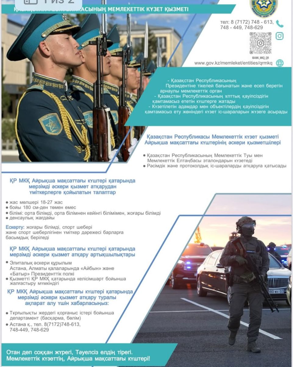 2025 жылдың 1 қыркүйегі мен 10 қазаны аралығында ҚР МСҰ өкілдері барлық облыс орталықтарында және республикалық маңызы бар қалаларда үміткерлерді іріктеу және зерттеу жүргізеді. Үміткерлерге келесі талаптар қойылады: жасы 18-27, бойы 180 см-ден кем емес, білімі: орта мектеп, колледж немесе университет, денсаулығы жақсы. Жоғары білімі бар, сондай-ақ спорттық жетістіктері мен шендері бар әскерге шақырылушыларға басымдық беріледі. ҚР МСҰ іріктеуден өткен әскерге шақырылғандар Астана және Алматы қалаларында орналасқан 0111, 0112 әскери бөлімдерінде қызмет етеді. Қазақстан Республикасы Мемлекеттік күзет қызметінің қатарында әскери міндеттілер Қазақстан Республикасы Президентінің және басқа да күзетілетін адамдардың қауіпсіздігін қамтамасыз ету, салтанатты және хаттамалық іс-шараларға қатысу, Қазақстан Республикасының Мемлекеттік Туы мен Мемлекеттік Елтаңбасының эталондарын қорғау және т.б. сияқты ерекше тапсырмаларды орындайды. Жастар ҚР СМҰ әскери бөлімдерінде әскери қызметін өтеу кезінде тәжірибелі нұсқаушылардың жетекшілігімен әскери іс бойынша дайындықтан өтеді, жауынгерлік және арнайы дайындық сабақтарында әскери мамандықтарды меңгереді. ҚР МСҚ әскерге шақыру қызметінің әскери қызметшілерінің одан әрі кадрлық өсу мүмкіндігі бар. Әскери қызмет өткергеннен кейін ниет білдірушілер келісім-шарт бойынша қызметін жалғастыра алады, содан кейін арнайы мемлекеттік органның қызметкері мен офицері болып, күзетілетін адамдар мен объектілердің қауіпсіздігін қамтамасыз ету жөніндегі тапсырмаларды орындай алады. ҚР МСМ әскерге шақыру қызметінің әскери қызметшілеріне қатысты әскери қызмет өткерген азаматтарды әлеуметтік қамтамасыз ету үшін Қазақстан Республикасында белгіленген барлық жеңілдіктер қолданылады. Байланыс телефоны: +77761017788