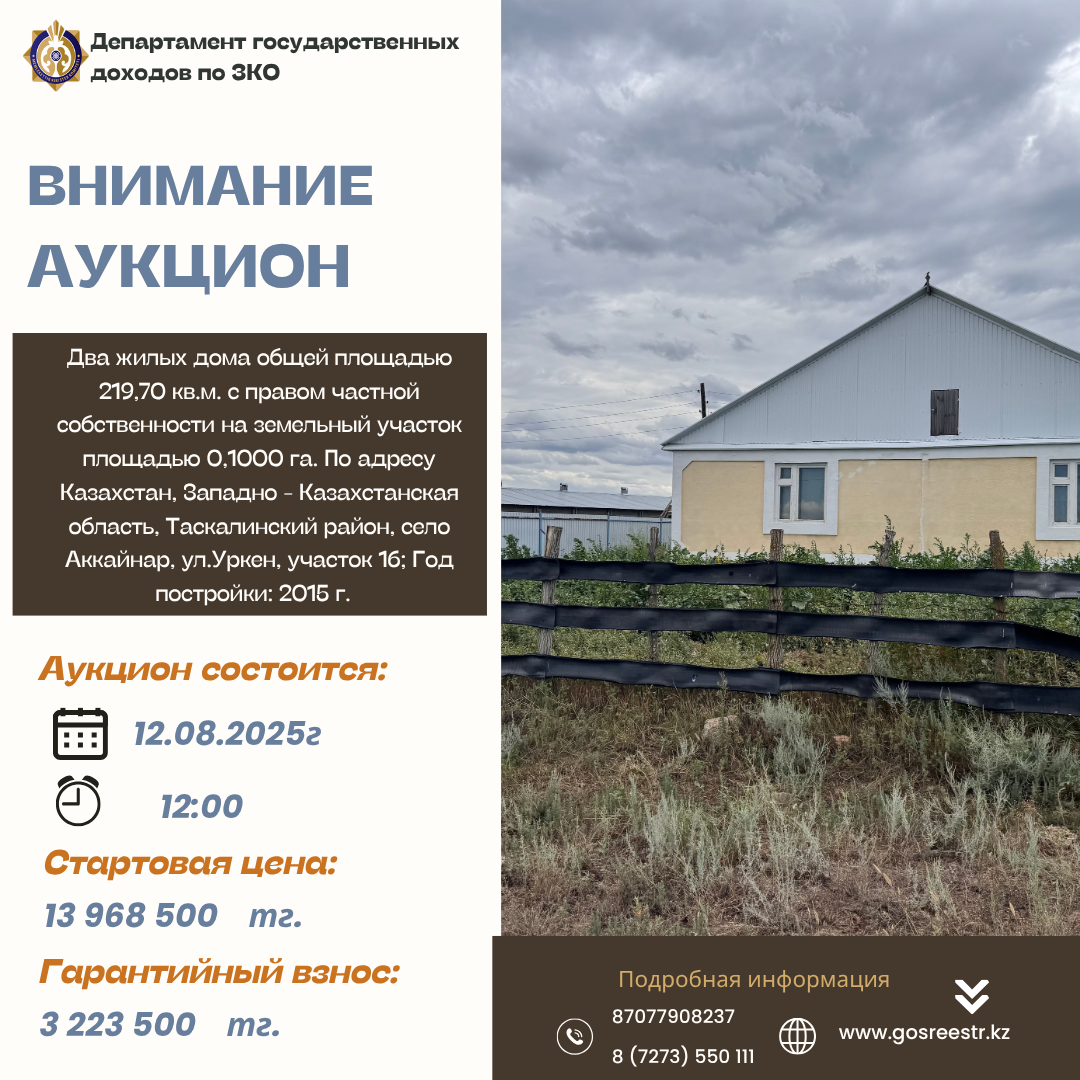 ХабарландыруСатылатын объекті:Екі тұрғын үй, жалпы ауданы 219,70 ш.м. 0,1000 га жер учаскесіне жеке меншікқұқығымен. Кұрылыс жылы: 2015 жыл: Батыс Қазақстан облысы,Тасқала ауданы, Аққайнар ауылы, Өркен көшесі, 16-учаске мекенжайы бойыншаАукцион өткізілетін күні: 12.08.2025 ж., 12:00Бастапқы бағасы: 13 968 500 тенге.Кепілдік жарна: 3 223 500 тенге.Ақпарат көзі : https://www.gov.kz/memleket/entities/kgd-zko/press/news/details/1046427?lang=kk
