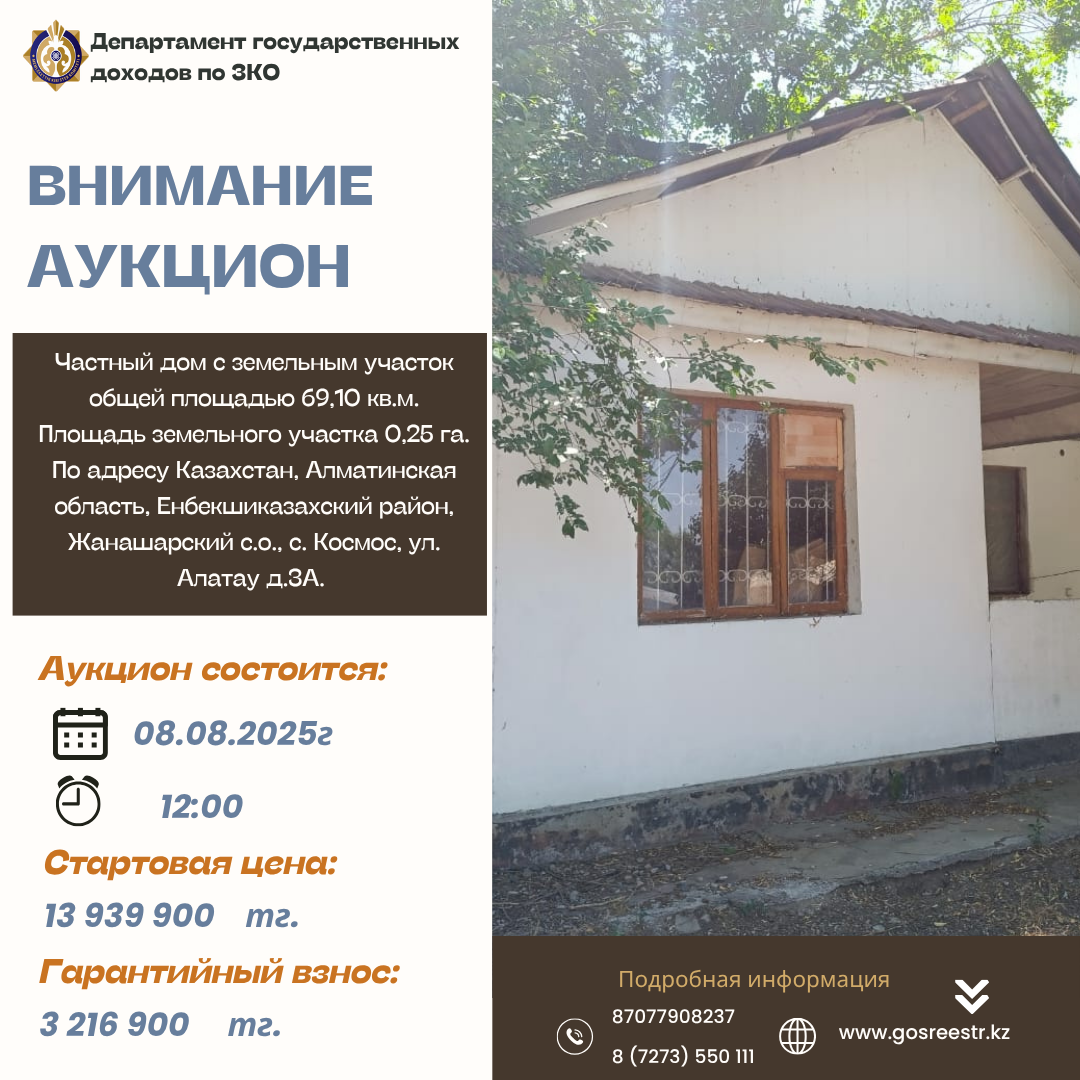 ХабарландыруСатылатын объекті:Жеке тұрғын үй бар жер тілімі, жалпы ауданы 69,10 ш.м. Жер учаскесі ауданы 0,25 га; Салынған жылы 2002 жыл Алматы облысы, Енбекшіқазақ ауданы, Алатау көшесі, 3.ААукцион өткізілетін күні: 08.08.2025 12:00Бастапқы бағасы: 13 939 900 тенге.Кепілдік жарна: 3 216 900 тенге.Ақпарат көзі : https://www.gov.kz/memleket/entities/kgd-zko/press/news/details/1046422?lang=kk