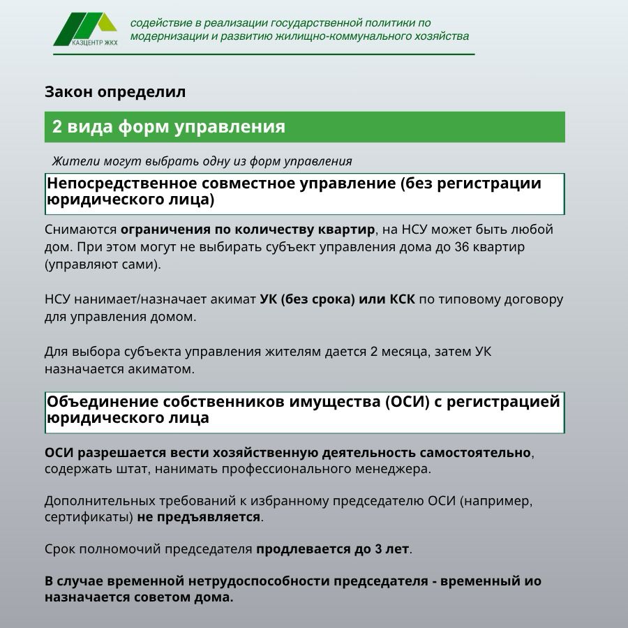 «Тұрғын үй қатынастары туралы» Заңға енгізілген маңызды өзгерістер жергілікті атқарушы органдар тарапынан бақылауды күшейтуге бағытталған. 1997 жылдан бастап тұрғын үйді басқарудың нысандары бірнеше рет өзгертілді. Бастапқыда келесі нұсқалар көзделген болатын: меншік иелерінің кооперативтері, тұрғындар тарапынан тікелей басқару және үшінші тарап басқарушы субъектілері. 1) егер меншік иелерінің саны төртеуден аспаса, олардың барлығы арқылы тікелей бірлесіп басқару; 2) үй-жайлар (пәтерлер) меншік иелерінің кооперативі; 3) кондоминиум нысанын үшінші (сыртқы) жеке (тұрғын үйді басқарушы) немесе заңды тұлғалар (тұрғын үй-коммуналдық қызмет көрсететін мекеме) арқылы басқару; 4) Қазақстан Республикасының заңнамасына қайшы келмейтін өзге де нысандар. Уақыт өте келе меншік иелерінің құқықтары нақты әрі кеңейтіле түсті. 2009 жылдан бастап:егер меншік иелерінің саны жиырмадан аспаса, олардың барлығы арқылы тікелей бірлесіп басқару;үй-жайлар (пәтерлер) меншік иелерінің кооперативі;кондоминиум нысанын үшінші тұлғалар: сайланатын немесе жалдамалы тұрғын үй басқарушы (менеджер) немесе заңды тұлғалар арқылы басқару;Қазақстан Республикасының заңнамасына қайшы келмейтін өзге де нысандар. Азаматтар тарапынан шағымдардың санының артуы мен кондоминиум нысандарындағы жағдайға ықпал ету тетіктерінің болмауына байланысты өзгерістер енгізіліп, 2025 жылдан бастап үй иелеріне өз меншігін басқаруға мүмкіндік беретін неғұрлым икемді жүйе енгізілді. Жауапсыз басқарушыны ауыстыру рәсімі жеңілдетілді, бұл өз кезегінде басқарушы субъектілер арасында бәсекелестікті арттырып, тұрғын үй-коммуналдық қызметтер сапасын жақсартуға мүмкіндік береді. Қандай басқару нысандары қолжетімді? Тікелей бірлесіп басқару (ТББ):Заңды тұлға құрмай-ақ басқаруға болады – пәтер санына шектеу жоқ. Меншік иелері жиналыс хаттамасының негізінде басқарушы компанияны бекітіп, қаржы-шаруашылық қызметпен айналыспай-ақ қойса болады.Егер пәтер саны 36-дан асса, нысанды басқаруға беру міндеті болып табылады.Басқарушы субъектілер жиналысқа: көрсетілетін қызметтердің саны мен мерзімділігін көрсететін сметаны, тарифтің негіздемесін, әрбір үйге жеке ашылған ағымдағы және жинақ шоттардың болуын ұсынуға міндетті.Бұл талаптар салалық заңнаманы сақтау мен басқарушы субъектілердің жұмысын реттеуге мүмкіндік береді. Мысалы, бірыңғай есеп айырысу орталықтарымен (БЕАО) шарт жасау кезінде әрбір үй үшін ашылған шоттар туралы анықтамалар қажет болады. Сондай-ақ, бұл тұрғын үй инспекцияларының функцияларын кеңейтуге мүмкіндік береді: кондоминиум объектісінің тіркелгенін, ПИК секілді субъектілердің тек Типтік жарғы негізінде жұмыс істейтінін, шоттардың ашылғанын тексеру. Бұл талаптар мен өзгерістер ТКШ саласының барлық қатысушылары үшін оң жағынан әсер етеді. Мүлік иелері бірлестігі (МИБ):Заңды тұлға – егер меншік иелері өз үйлерін қаржылық-шаруашылық жағынан өздері басқаруға дайын болса және жауапты адамдар болса, МИБ тіркеледі.Негізгі айырмашылығы – ағымдағы және жинақ шоттарға және барлық түсімдерге (тариф, жалға беру, жарнама т.с.с.) меншік иелерінің өздері толық бақылау жасайды.МИБ кезінде меншік иелері – толық құқықты тапсырыс беруші болып табылады. Басқару субъектілерін жалдауға немесе еңбек шарты бойынша МИБ ретінде жұмысын қарастыра алады, әкімшілік құжат айн