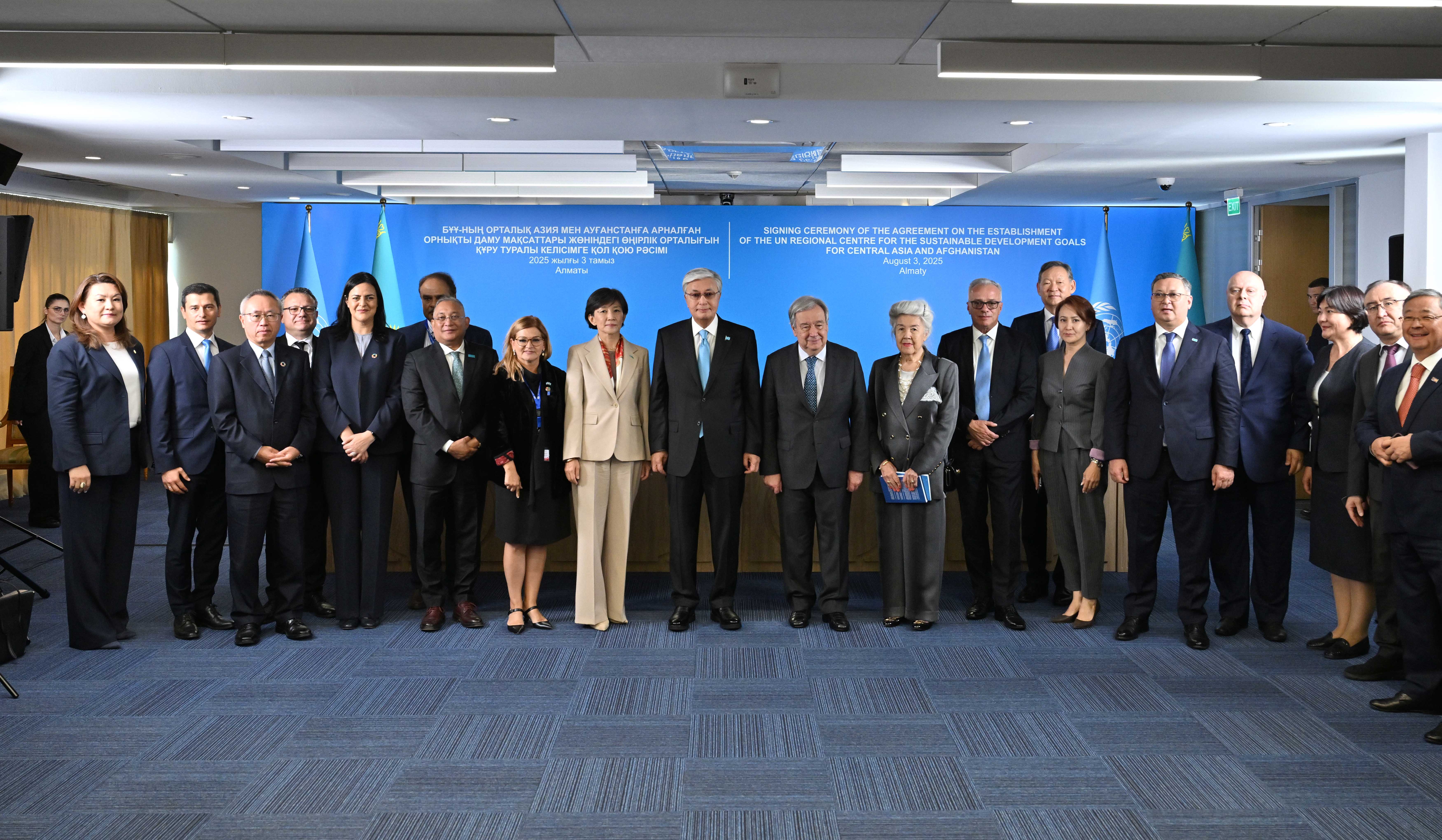 Алматы, 2025 жылғы 3 тамыз - Мемлекет басшысы Қасым-Жомарт Тоқаев пен Біріккен Ұлттар Ұйымының Бас хатшысы Антониу Гутерриш Қазақстан Үкіметі мен Ұйым арасында БҰҰ-ның Орталық Азия мен Ауғанстанға арналған орнықты даму мақсаттары жөніндегі өңірлік орталығын құру туралы келісімге қол қою рәсіміне қатысты.Қасым-Жомарт Тоқаев ең әуелі осы айтулы іс-шараға қатысқаны үшін БҰҰ Бас хатшысы Антониу Гутерришке ризашылығын білдірді.Президент бүгінгі іс-шараның Қазақстан ғана емес, Біріккен Ұлттар Ұйымы үшін де елеулі сипатқа ие екенін атап өтті. Бұл оқиға дүниежүзілік картада өте салмақты акторға айналып келе жатқан Орталық Азияның маңызы жөнінде халықаралық қоғамдастыққа айқын белгі бергенін жеткізді.Мемлекет басшысының айтуынша, қол қойылған келісім арқылы Орталық Азия мен Ауғанстан үшін орнықты даму мақсаттары жөніндегі өңірлік орталықтың құрылуы ресми түрде бекітілді. Бұл – Қазақстан мен БҰҰ арасындағы ұзақ мерзімді және жемісті ынтымақтастықтың маңызды кезеңі.– Геосаяси дүрбелеңдер мен қақтығыстар белең алып, климаттық өзгерістер күрделенген және азық-түлік қауіпсіздігіне қатер төнген шақта Біріккен Ұлттар Ұйымы әлемдегі қауіпсіздік пен тұрақтылықты сақтауда басты рөл атқаруға тиіс. Қазақстан үшін БҰҰ халықаралық тәртіптің баламасыз әрі басты тірегі болып қала береді. Еліміз Ұйымға кірген сәттен бастап, 33 жыл бойы халықаралық қоғамдастықтың жауапты, белсенді әрі бейбітсүйгіш мүшесі екенін жан-жақты танытып келеді, – деді Президент.Қасым-Жомарт Тоқаевтың пікірінше, Алматы қаласында БҰҰ өңірлік орталығының ашылуы аймақтың стратегиялық маңызы артып келе жатқанын көрсетеді.– Бүгінде Орталық Азия бірлігі бекем және тату көршілік пен ортақ прогресс қағидаттарына бейіл өңір екенін паш етіп келеді. Аймақ елдері саяси және әлеуметтік реформалар жүргізіп, экономиканы әртараптандыру бойынша батыл шаралар қабылдап жатыр. Адам капиталын дамытуға күш салып, анағұрлым инклюзивті институттар құруды қолға алды. Біз халықаралық өзекті мәселелерді шешуге белсенді араласатын мәмілегер ретінде Орталық Азияның әлеуетін ашуға және жаһандық аренада конструктивті әрі келешекті көздеген күн тәртібін дәйекті түрде ілгерілетуге ұмтыламыз. Осы орайда Алматы қаласында БҰҰ өңірлік орталығын ашу уақтылы және стратегиялық тұрғыдан маңызды қадам болып отыр, – деді Мемлекет басшысы.Президент Орталық аймақтағы елдер экономикасының орнықтылығы мен қарқынын күшейтуге, өңірлік инновацияны дамытуға және ынтымақтастықты тереңдетуге бағытталған үйлесімді іс-қимылдар катализаторы болады деп пайымдайды.– Аталған Орталықтың құзыреті мен функциялары аймақтағы немесе одан тысқары жерлердегі басқа ұйымдардың қызметін қайталамайды. Керісінше, Орталық аймақ халқының нақты сұранысына назар аударудың арқасында қабылданып жатқан шараларды толықтырып, оның мән-мазмұнын арттыра түседі. Арал теңізіндегі экологиялық дағдарыс пен Каспий теңізінің тартылуы сияқты Орталық Азия проблемалары баршаға белгілі. Бұл түйткілдердің тиімді шешімін табу үшін өңірлік ықпалдастықты нығайтып, оған Біріккен Ұлттар Ұйымын белсенді түрде тарту қажет. Осы ретте Қазақстан келесі жылдың сәуір айында Астанада БҰҰ агенттіктерімен бірге Өңірлік экологиялық саммит өткізеді, – деді Мемлекет басшысы.Қасым-Жомарт Тоқаевтың айтуынша, Ауғанстанның бейбіт ө