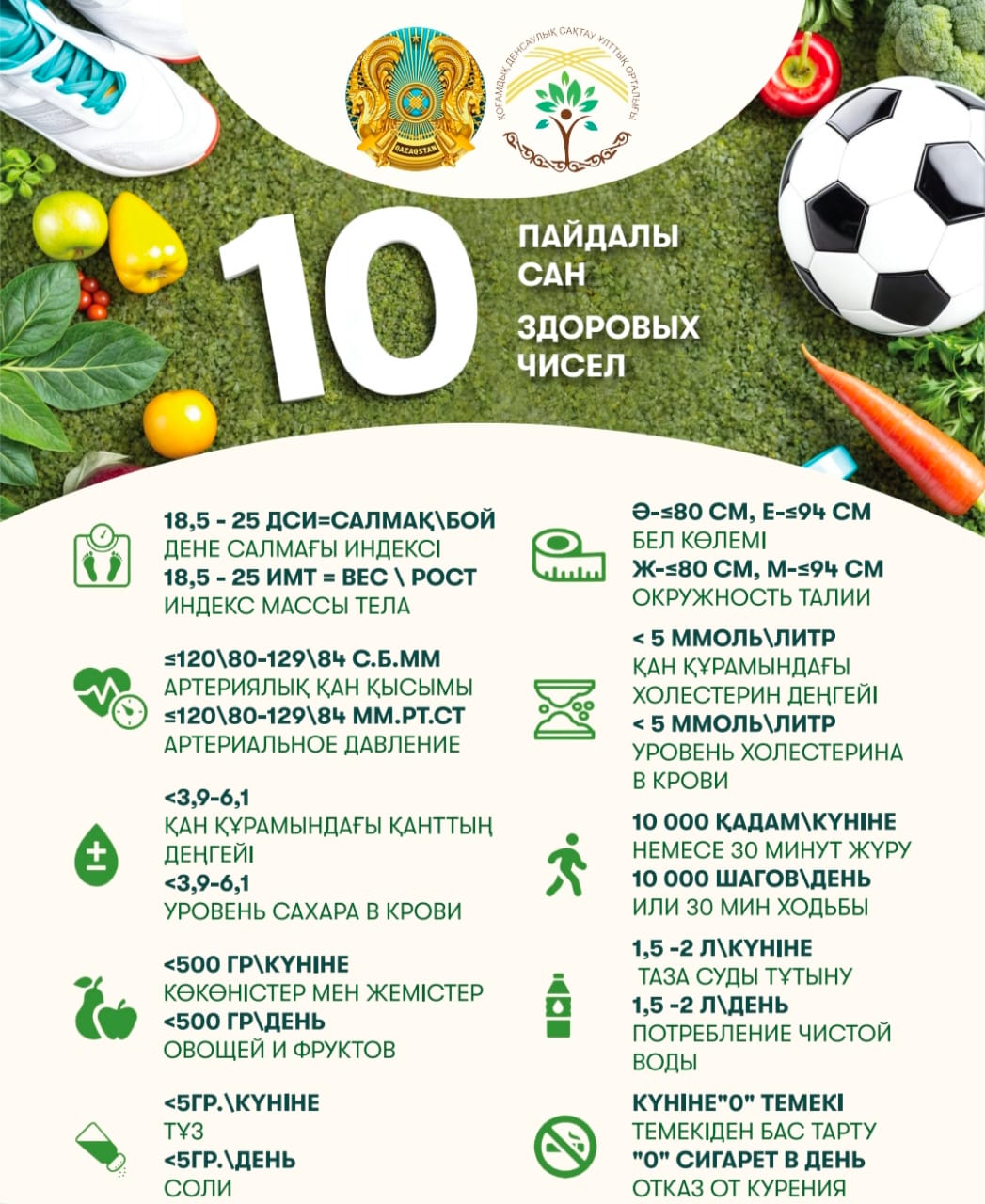 Қазіргі заманда технологиялар күннен-күнге дамып, күнделікті тіршілікті жеңілдетуде. Алайда, бұл жайлылықпен бірге өмірімізге қозғалысы аз өмір салты да еніп жатыр. Күні бойы компьютер алдында отырамыз, жолда – көлік кептелісінде тұрамыз, кешкісін – теледидар алдында боламыз. Нәтижесінде, ұйқыға, дұрыс тамақтануға, дене белсенділігіне және жақындармен қарым-қатынасқа уақыт жетіспей жатады.Күнделікті қарбаластан денсаулықты ұмыт қалдырмау үшін Ұлттық қоғамдық денсаулық сақтау орталығы қарапайым әрі көрнекі еске салғыш әзірледі – «10 денсаулық саны». Бұл – денсаулық күйіңізді бағалап, маңызды күнделікті дағдыларды еске түсіретін компас іспетті.Міне, сол көрсеткіштердің кейбірі:8 сағат ұйқы – ағзаны қалпына келтіріп, психоэмоционалдық тепе-теңдікті сақтайды;Күніне 5 порция көкөніс пен жеміс – иммунитет пен қуаттың негізі;Күніне 10 000 қадам – жүрек пен тамырларды сергек ұстаудың оңай жолы;Тәулігіне 5 г тұздан аспау – гипертониядан сақтану үшін;Күніне кемінде 2 литр таза су – тері, бүйрек және зат алмасу үшін пайдалы.Бұл сандар өмір салтыңызды түбегейлі өзгертуді талап етпейді – керісінше, олар тұрақты әрі шағын қадамдар арқылы ұзақ жылдар бойы денсаулықты сақтауға болатынын көрсетеді.Өзіңізге қамқорлық жасауды кішіден бастаңыз. Осы еске салғышпен танысыңыз және алғашқы қадамыңызды жасаңыз – өйткені болашаққа жасалатын ең тиімді инвестиция – бүгінгі өз денсаулығыңызға деген көңіл.Ақпарат көзі : https://www.gov.kz/memleket/entities/departament-kkbtu-akmolinsk/press/news/details/1017900?lang=kk