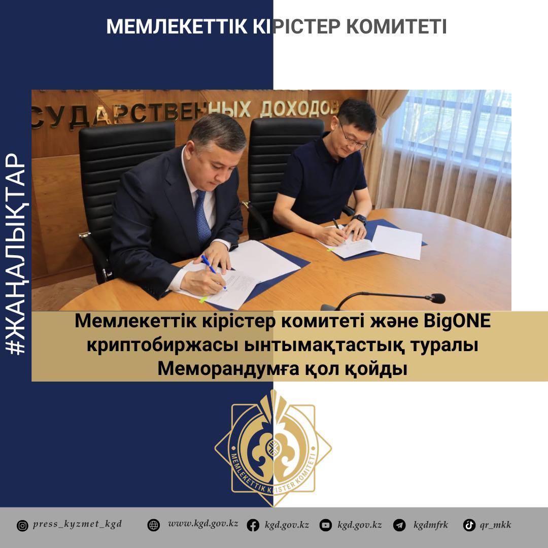 2025 жылғы 4 маусымда Қазақстан Республикасы Қаржы министрлігінің Мемлекеттік кірістер комитеті мен халықаралық BigONE криптовалюта биржасы ынтымақтастық туралы Меморандумға қол қойды. Келісімге МКК атынан Комитет Төрағасының орынбасары Сеилжан Ахметов және BigONE компаниясының акционері Тянь Юнбинь қол қойды. Мақсаты – цифрлық активтер саласындағы салықтық әкімшілендіру, тәжірибе алмасу және кәсіби біліктілікті арттыру бойынша ынтымақтастықты нығайту. Кездесу барысында тараптар келесі мәселелерді талқылады: - криптоиндустрия мен экономиканы цифрландырудың даму перспективалары; - Қазақстанның жаһандық криптонарықтағы негізгі қатысушылардың бірі ретіндегі өсіп келе жатқан рөлі; - Қазақстан Республикасы Президентінің Crypto City құру және цифрлық активтер айналымына арналған заманауи инфрақұрылымды қалыптастыру жөніндегі бастамасы. Қазақстан тарапынан BigONE компаниясымен ынтымақтастық: - криптовалюта операцияларының ашықтығын арттыруға; - цифрлық ортада әділ әрі тиімді салық салуды қамтамасыз етуге; - цифрлық активтер саласының тұрақты дамуына қолайлы жағдай жасауға ықпал етеді деген сенім білдірілді.Ақпарат көзі : https://www.gov.kz/memleket/entities/kgd-akmola/press/news/details/1013099?lang=kk