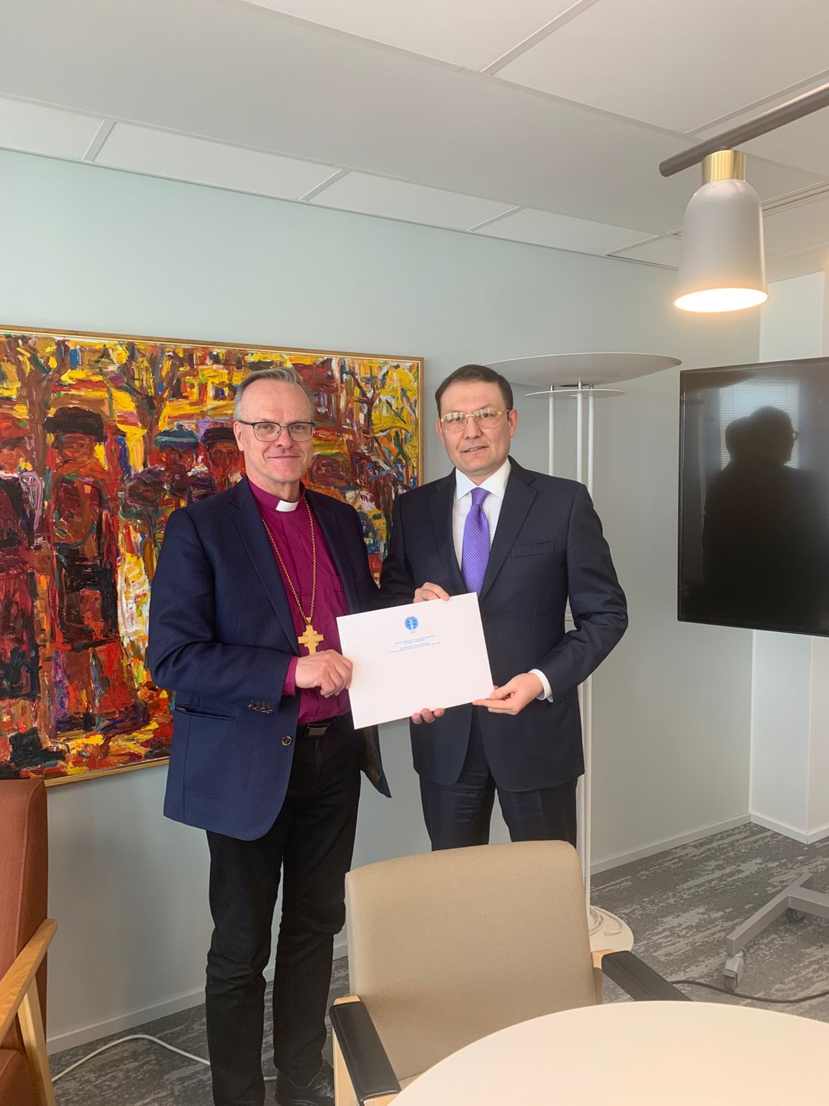 Хельсинки, 2025 жылғы 22 мамыр - Қазақстанның Финляндиядағы Елшісі Азамат Әбдіраимовтың Финляндияның Евангелиялық-лютерандық шіркеуінің басшысы Тапио Лууомамен кездесуі өтті.Қазақстандық дипломат сұхбаттасушыны Қазақстанда жүргізіліп жатқан дінаралық диалог саясатымен, 2025 жылғы қыркүйекте өтетін Әлемдік және дәстүрлі діндер лидерлерінің VIII Съезімен таныстырды, сондай-ақ Т.Лууомға ҚР Парламенті Сенатының төрағасы М. Әшімбаевтың атынан ресми шақыру тапсырды.Евангелиялық-лютерандық шіркеудің басшысы шақырғаны үшін ризашылығын білдіріп, Қазақстанның толеранттылықты нығайтуға және діндердің бейбіт қатар өмір сүру идеясын ілгерілетуге бағытталған күш-жігерін жоғары бағалай отырып, алдағы Съезге қатысатынын растады.Ақпарат көзі : https://www.gov.kz/memleket/entities/mfa-helsinki/press/news/details/1002198?lang=kk
