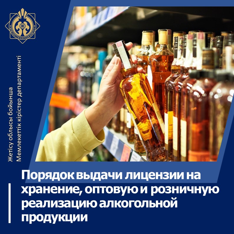 Өтініштерді қабылдау және лицензиялар беру www.egov.kz электронды үкімет веб-порталы, «Е-лицензиялау» мемлекеттік деректер базасы АЖ, http://internal.elicense.kz арқылы жүзеге асырылады.Қазақстан Республикасының Қаржы министрлігі Мемлекеттік кірістер комитетінің облыстар, Астана, Алматы және Шымкент қалалары бойынша аумақтық органдары алкоголь өнімін сақтауға, көтерме және бөлшек саудада өткізуге лицензия береді (беру мерзімі – 1 (бір) жұмыс күнінен кешіктірмей).Астанада, республикалық және облыстық маңызы бар қалаларда алкоголь өнімдерін сақтауға және бөлшек саудада өткізуге лицензия бергені үшін лицензиялық алымның мөлшерлемесі – 100 АЕК;аудандық маңызы бар қалалар мен ауылдарда – 70 АЕК;ауылдық жерлерде – 30 АЕК.Алкоголь өнімдерін сақтауға және көтерме саудаға лицензия беру үшін лицензиялық алым мөлшерлемесі – 200 АЕК құрайды.Құжаттар тізбесі:- электронды құжат түріндегі өтініш;- лицензиялық алымның бюджетке төленгенін растайтын құжаттың электрондық көшірмесі;денсаулық сақтау, білім беру ұйымдарының, денешынықтыру-сауықтыру, спорттық және спорттық-техникалық құрылыстардың, автожанармай құю станцияларының, сауда базарларының, мәдени-демалыс ұйымдарының ғимараттарынан тысқары және аумақтарында орналасқан, меншік құқығындағы немесе уақытша иелік ету (пайдалану), өтеусіз пайдалану құқығындағы, тұрақты тұруға қарағанда өзге мақсатқа пайдалануға арналған стационарлық үй-жайлар (бөлшек саудада өткізу үшін), қойма үй-жайларын (көтерме саудада өткізу үшін) шартының электрондық көшірмесі;- біліктілік талаптарына мәліметтер нысаны электрондық құжат нысанында толтырылады. Анықтама үшін: Алым сомалары белгіленген мөлшерлемелер бойынша есептеледі және уәкілетті мемлекеттік органға тиісті құжаттарды тапсырғанға дейін немесе лицензияны алғанға дейін алым төлеушінің орналасқан жері бойынша төленеді (БСК 105402).Алкоголь өнімін бөлшек саудада өткізу – алкоголь өнімін кейіннен тұтыну немесе коммерциялық емес пайдалану үшін фискальдық жады бар бақылау-касса машинасымен жарақтандырылған, сауда залымен жабдықталған стационарлық үй-жайларда және мейрамханалар, барлар мен дәмханалар аумағында, сондай-ақ жолаушылар тасымалдайтын әуе кемелерінде, жолаушылар тасымалдайтын теңіз көлігі кемелерінде, жолаушылар пойызының вагон-мейрамханаларында жүзеге асырылатын сату.Алкоголь өнімін көтерме саудада өткізу – алкоголь өнімін лицензияда көрсетілген мекенжай бойынша қойма үй-жайларынан шектеусіз көлемде босату. Ақпарат көзі : https://www.gov.kz/memleket/entities/kgd-zhetysu/press/news/details/1106167?lang=kk