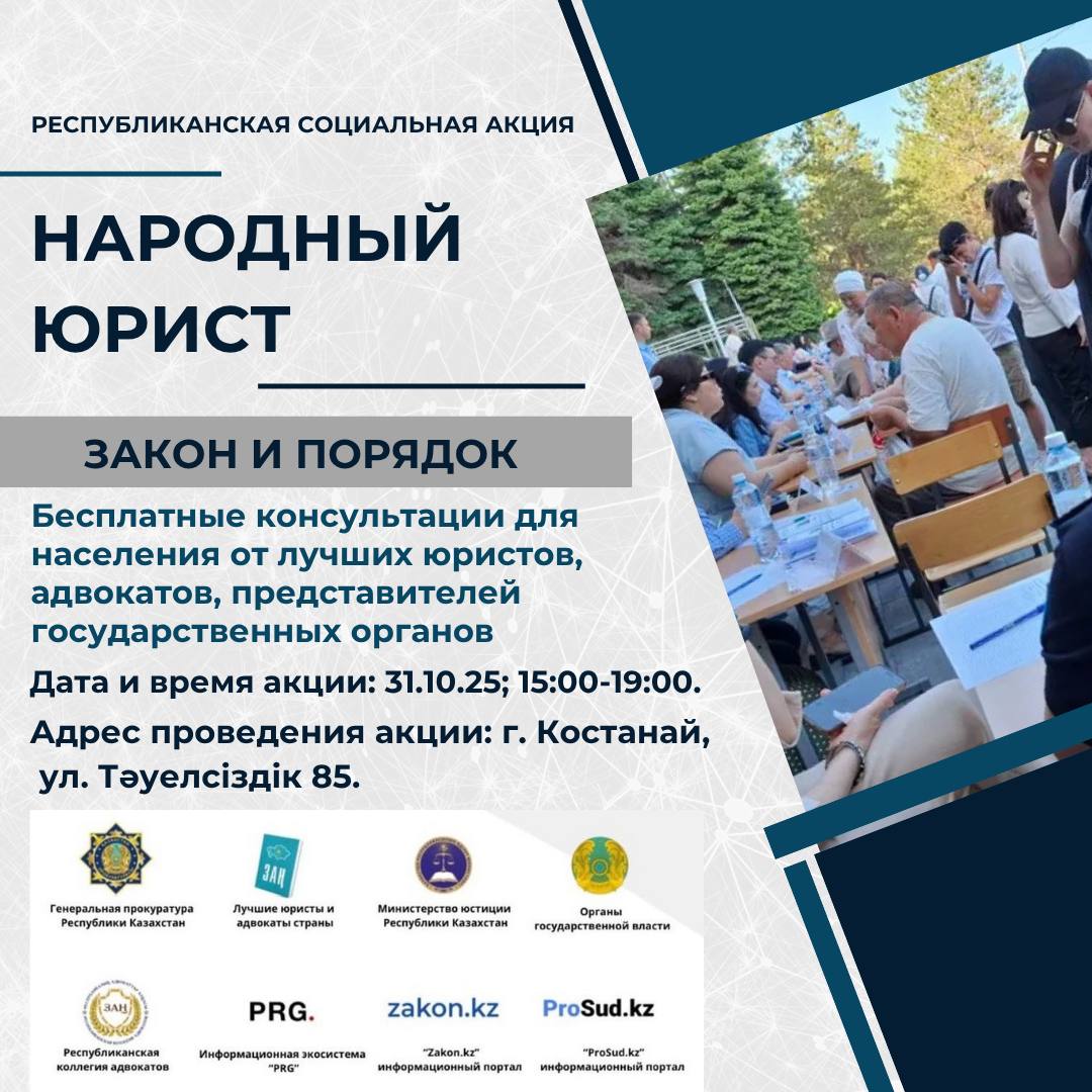 Көмектесу үшін бірігеміз!31 қазан күні 15:00-19:00 Қазақстанның барлық ірі қалаларында бір мезгілде «ХАЛЫҚ ЗАҢГЕРІ» республикалық акциясы басталады!Егер құқық жөнінде сұрақтарыңыз болса және ол жайында сауатты консультация алғыңыз келсе, ҚР үздік сарапшыларынан консультация алу мүмкіндігін пайдаланыңыз.«Халық заңгері» - мемлекеттік орган өкілдерінің, жетекші заңгерлердің, ҚР адвокаттарының халыққа заң бойынша тегін көмек көрсетуі.Іс-шараның ұйымдастырушылары: Қазақстан Республикасының Бас прокуратурасы, Әділет министрлігі, мемлекеттік билік органдары, Zakon.kz желілік басылымы, «Параграф» ақпараттық жүйесі, Республикалық адвокаттар алқасы, сондай-ақ Қазақстанның үздік заңгерлері мен адвокаттары.Акцияның өтетін орнын: Қостанай қ., Тәуелсіздік көш., 85.Заңгерлердің білікті көмегін қажет ететін азаматтарды күтеміз!Ақпарат көзі : https://www.gov.kz/memleket/entities/adilet-kst/press/news/details/1092810?lang=kk