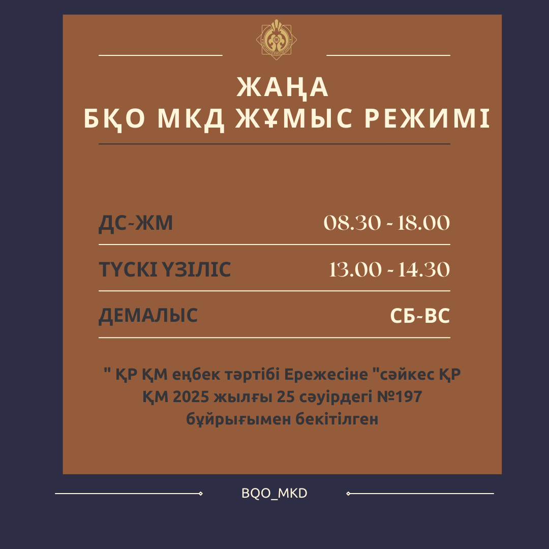 Батыс Қазақстан облысы бойынша Мемлекеттік кірістер департаментініңЖаңа жұмыс кестесі«Қазақстан Республикасы Қаржы министрлігінің Еңбек ережесінің қағидаларына» сәйкес бекітілгенҚазақстан Республикасы Қаржы министрлігінің 2025 жылғы 25 сәуірдегі No 197 бұйрығымен барлық аумақтықКомитеттің бөлімшелері (кезекші посттарды, кеденпосттар, бақылау-өткізу пункттері және басқа мамандандырылғантәулік бойы немесе ауысымдық жұмысты ұйымдастыру қажет бөлімдержұмыс кестесін қоспағанда), келесі жұмыс режимі белгіленеді:Басталуы: 08:30Соңы: 18:00Түскі үзіліс: 13:00 – 14:30 (90 минут)Жұмыс аптасының ұзақтығы: 5 күн (40 сағат).Ақпарат көзі : https://www.gov.kz/memleket/entities/kgd-zko/press/news/details/999498?lang=kk
