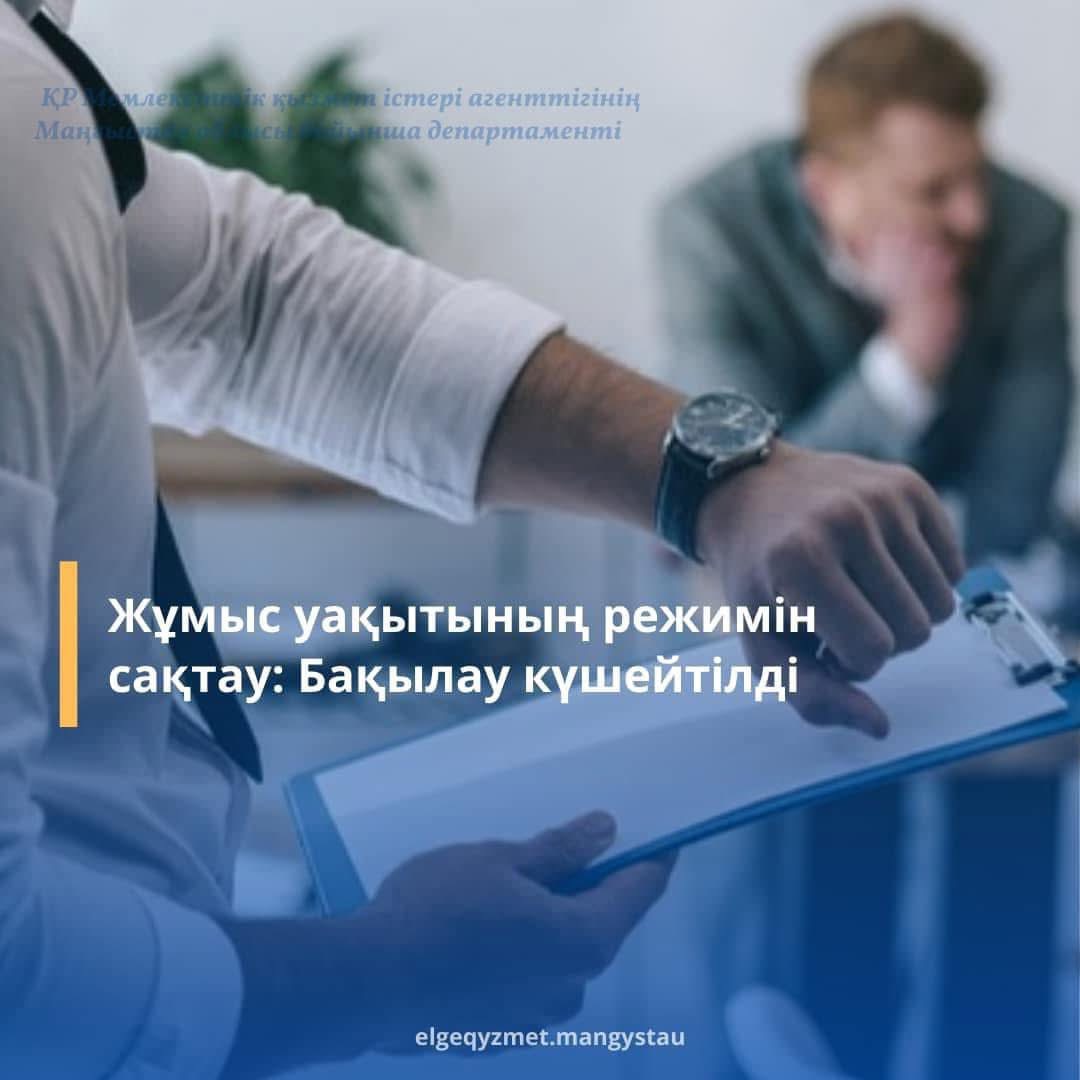 Мемлекеттік органдардың қызметшілері үшін сегіз сағаттық жұмыс уақытының режимі белгіленген. Мемлекеттік органдардың жұмыс уақыты режимінің сақталуына мониторингті жүргізуге уәкілетті орган Мемлекеттік қызмет істері агенттігі және оның аумақтық бөлімшелері болып табылады. Мониторинг жұмыстары мемлекеттік органдардың жұмыс уақыты режимін сақтауына мониторинг жүргізу Қағидаларының талабына сәйкес, кіруді басқару және бақылау жүйесінің «Е-қызмет» ақпараттық жүйесімен ықпалдастырылуы бойынша қашықтықтан және бару арқылы жүзеге асырылады. 2025 жылдың І тоқсанының қорытындысы бойынша аумақтық департаментпен мемлекеттік қызметшілердің мемлекеттік органның ғимаратының «Е-қызмет» ақпараттық жүйесімен ықпалдастыру мәселелерін анықтауға қатысты талдау жұмыстары жүргізілді. Аумақтық департаментпен, жұмыс уақыты режимінің сақталуы бойынша мемлекеттік органдарға бару арқылы мониторинг жүргізудің 2025 жылға арналған жоспар бекітілген.Жоспармен қамтылған 34 мемлекеттік органдарға 2025 жылы бару арқылы мониторинг жүргізілетіндігі ескертіліп, хат жолданды. 2025 жылдың алғашқы 3 айының қорытындысы бойынша аталған бағытта аумақтық департаментпен 20 мониторинг жұмыстары жүргізілген. Олардың арасында бару арқылы жүргізілген мониторингпен қамтылған 6 (оның ішінде – 1 бақылау бағытында жүргізілген тексеру кезіндегі мониторинг) мемлекеттік орган болса, қашықтықтан жүргізілген мониторингпен қамтылған мемлекеттік органдардың саны – 14.Ескертпелерге қарамастан, бару арқылы жүргізілген мониторинг нәтижесінде 4 құқықбұзушылық анықталды. Осыған орай, 4 мемлекеттік қызметшіге құқықтарын қалпына келтіру бағытында 8 сағат тынығу сағаттары берілді. Жүргізілген мониторинг нәтижелерінде 45 мемлекеттік қызметшінің құқығы қалпына келтірілді. Құқықтарын қалпына келтіру бағытында 45 мемлекеттік қызметшіге 496 сағат тынығу сағаттары белгіленді.Алдағы уақытта аумақтық департаментпен мониторинг жұмыстары және бару арқылы жүргізілмеген мемлекеттік органдарда қашықтықтан мониторинг жұмыстары тұрақты түрде жүргізілетін болады.Ақпарат көзі : https://www.gov.kz/memleket/entities/akimat-goroda-zhanaozen/press/news/details/999078?lang=kk