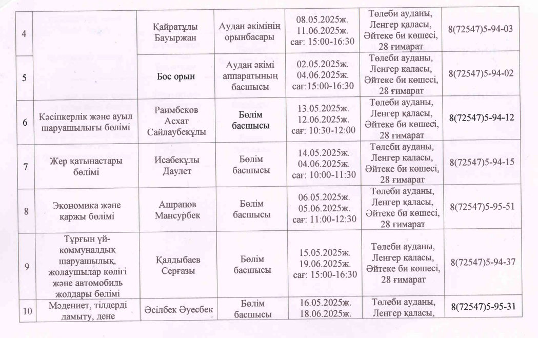 Төлеби ауданы әкімдігі басшыларының Азаматтарды қабылдау орталығында азаматтарды қабылдаудың 2025 жылғы 2-тоқсанға арналған кестесі 18.05.2025