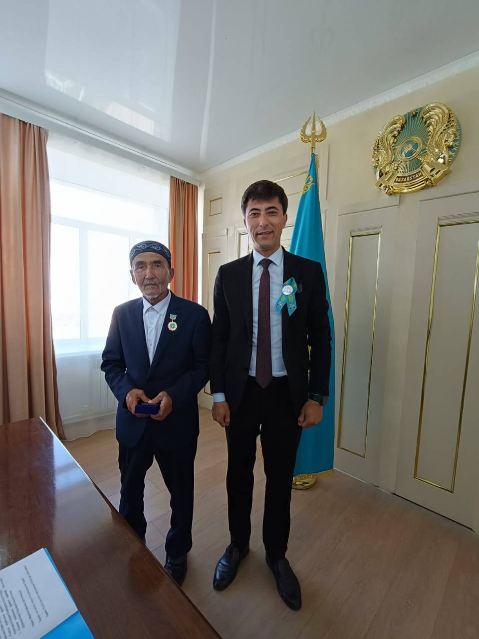 ТӨСБЕЛГІ ЖАУҒАН КҮН БОЛДЫСырым ауданы әкімінің орынбасары Қайрат Төлепов әкімдіктің шағын залында бір топ еңбек ардагерлерін қабылдап, шырайлы мерекелі күнмен құттықтады.Қабылдауда болған еңбек ардагерлері арасында мемлекттік қызметтің ардагері Жолдыбай Батырниязов, ауыл шаруашылығы және спорт ардагерлері Ысқақ Күрпілдесов, Сағынғали Айтанов, Брян Қажымов, Еркін Шүренов болды.Ұлы Жеңістің 80 жылдығы қарсаңындағы осынау айтулы шараның ерекшелігіне тоқталған Қайрат Нұржанұлы ерен еңбек иелерінің ел игілігіне қосқан үлестеріне баға беріп, мемлекеттік қызметтің ардагері Жолдыбай Батырниязовтың өңіріне ҚР «Ауыл шаруашылығы ардагерлер кеңесі», қоғамдық бірлестігінің «Құрметті ардагер» төсбелгісін тақты.Ал, ардагерлер Ы.Күрпілдесов, С.Айтанов, Б.Қажымов, Е.Шүреновтың өңірлеріне Сырым ауданының «Құрметті ардагері» төсбелгісі қадалды.Марапат иелерін құттықтаған Қайрат Нұржанұлы отбасыларына амандық, дендеріне саулық тіледі.Марапат иелері өздеріне көрсетілген құрметтер үшін алғыстарын айтты.Ал, аудандық ардагерлер кеңесінің төрағасы Мүсірбек Айташев, Жымпиты ауылдық ардагерлер кеңесінің төрағасы Ғилаж Қаналиев марапат иелерін құттықтап, сөз сөйледі.«Сырым елі»Ақпарат көзі : https://www.gov.kz/memleket/entities/bko-syrym/press/news/details/991394?lang=kk