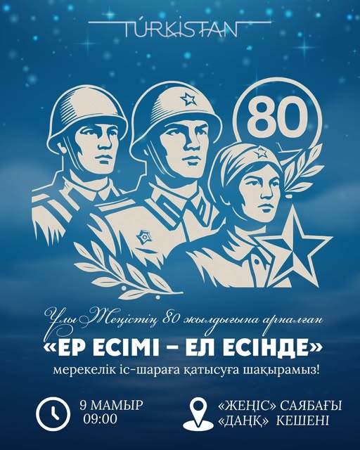Сіздерді Ұлы Жеңістің 80 жылдығына арналған «Ер есімі – Ел есінде» атты гүл шоқтарын қою және мерекелік іс-шараға қатысуға шақырамыз.Өтетін орны: Түркістан қаласы, «Жеңіс» саябағы, «Даңқ» мемориалдық кешеніУақыты: 9 мамыр, сағат 09:00Ақпарат көзі : https://www.gov.kz/memleket/entities/turkestan-kalasy/press/news/details/992598?lang=kk
