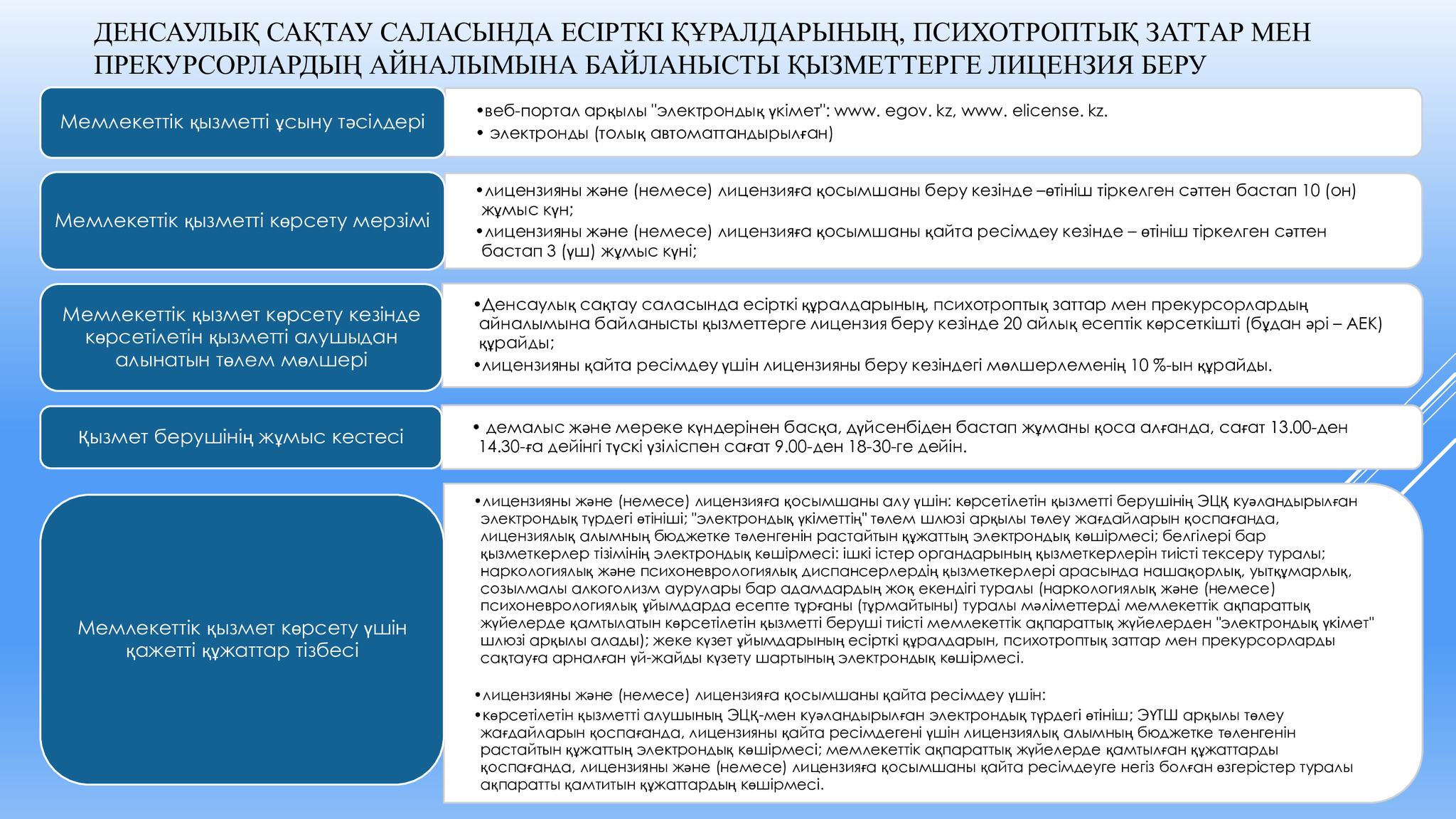 ДЕНСАУЛЫҚ САҚТАУ САЛАСЫНДА ЕСІРТКІ ҚҰРАЛДАРЫНЫҢ, ПСИХОТРОПТЫҚ ЗАТТАР МЕН ПРЕКУРСОРЛАРДЫҢ АЙНАЛЫМЫНА БАЙЛАНЫСТЫ ҚЫЗМЕТТЕРГЕ ЛИЦЕНЗИЯ БЕРУАқпарат көзі : https://www.gov.kz/memleket/entities/dkmfk-mangistau/press/news/details/993857?lang=kk