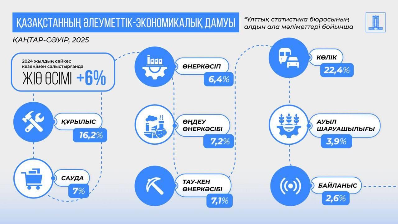 Ұлттық статистика бюросының болжамды деректеріне сәйкес, еліміздің 2025 жылғы қаңтар-сәуірдегі әлеуметтік–экономикалық дамуының алдын ала қорытындылары.Биылғы төрт айдың қорытындысы бойынша ЖІӨ өсімі 6%-ды құрады. Экономиканың негізгі салаларында: көлікте (22,4%), саудада (7%) даму қарқынының артқаны байқалады. Өсім ауыл шаруашылығы (3,9%) және байланыс (2,6%) салаларында да тіркелді.Көлік саласындағы өсім саланың жалпы көлеміндегі үлестері тиісінше 20,5% және 19,6%-ды құрайтын темір жол және құбыр көлігімен жүктерді тасымалдау жөніндегі қызметтер көлемінің ұлғаюы есебінен қамтамасыз етілді. Жоғары динамика Түркістан (21,8%), Жамбыл (11,2%) және Абай (14,9%) облыстарында тіркелді.Құрылыс саласында нақты жұмыс көлемінің индексі 16,2%-ды құрады. Сонымен қатар құрылыс кезеңін ескере отырып, жұмыстарды орындау қарқынын арттыру және жобалар құнының өсуіне жол бермеу үшін жергілікті жерлерде қажетті үйлестіруді қамтамасыз ету тапсырылды.Сауда саласы бірінші тоқсандағы 6,3%-ға қарағанда 7% тұрақты өсуді көрсетті. Көтерме сауда көрсеткіші 7,4%-ға, бөлшек сауда көрсеткіші 6,1%-ға дейін өсті. Бірқатар өңірлер: Түркістан облысы – жемістерді, көкөністерді, фармацевтикалық тауарларды сататын кәсіпорындар есебінен 60,4%; Ақмола облысы – астықты, тұқымдарды және мал азығын сататын кәсіпорындардың арқасында 44%; Шымкент – дизель отынын, фармацевтикалық тауарларды, қара және түсті металдардың сынықтары мен қалдықтарды сататын кәсіпорындар есебінен 19,8%-ға жоғары өсімді көрсетті.Өнеркәсіпте өндіріс индексі 6,4% жетті. Өсім тау-кен секторында – 7,1%, атап айтқанда көмір өндіруді ұлғайту есебінен (11,2%) байқалып отыр. Өңдеу өнеркәсібінде көрсеткіш 7,2% құрайды, оның ішінде тамақ өнімдерін өңдеу (12%), темекі өнімдерін (26,3%), химиялық өнімдерді өндіру (11,2%) және машина жасау (11,2%).Ауыл шаруашылығы оң динамиканы көрсетуде. Жалпы өнім индексі қаңтар-сәуір айларында 3,9%-ды құрады.Үкімет Президенттің еліміздің орнықты әлеуметтік-экономикалық дамуын қамтамасыз ету жөніндегі тапсырмаларының сапалы іске асырылуын бақылауда ұстайды.https://t.me/presseconomyАқпарат көзі : https://www.gov.kz/memleket/entities/aktobe-shalkar-bozoy/press/news/details/993129?lang=kk