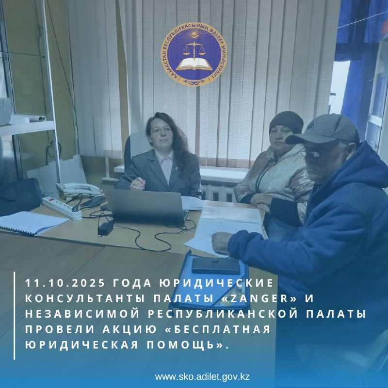 2025 жылғы 11 қазанда «Тәуелсіз республикалық палата» мен «Zanger» палатасының заң консультанттары халыққа арналған «Тегін заң көмегі» акциясын «Заң және тәртіп» идеологиясын іске асыру аясында өткізді. 15.10.2025