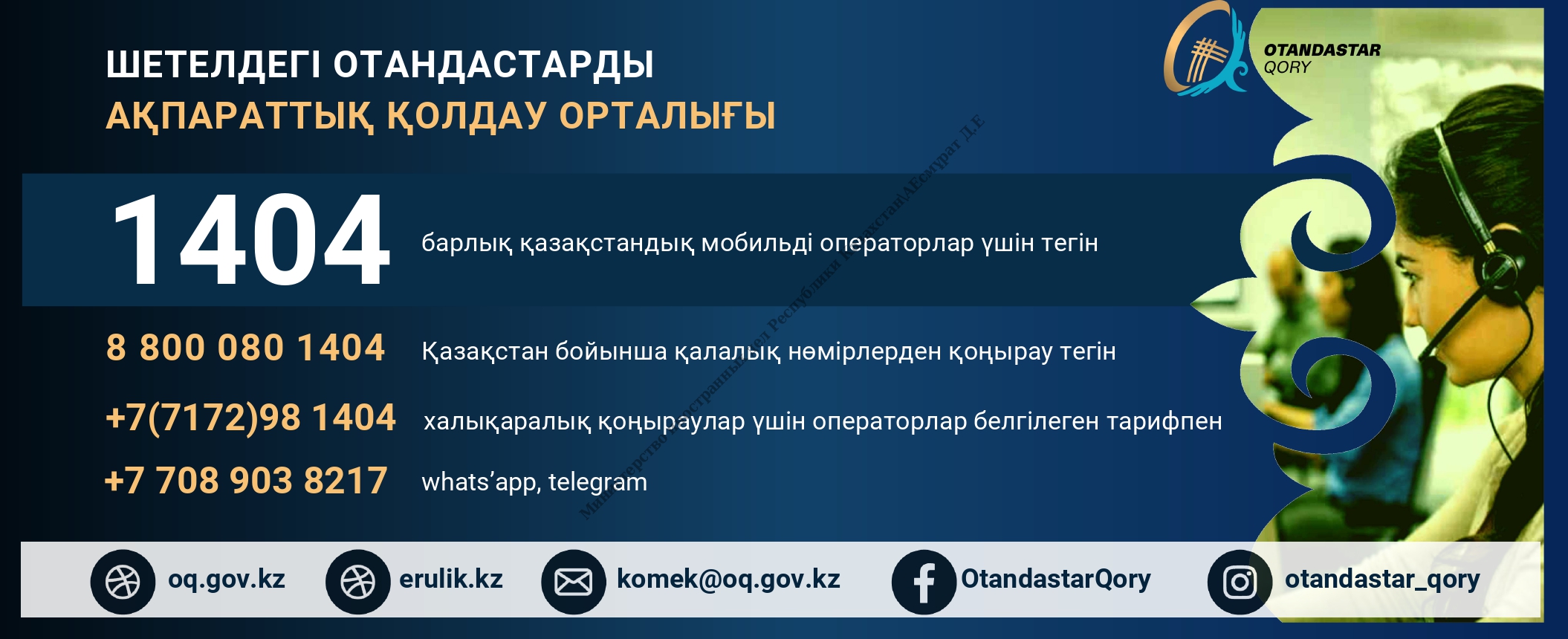 «Отандастар қоры» шетелдегі қазақстандықтарға тәулік бойы көмек көрсететін ақпараттық қолдау орталығының (Call Center 1404) жұмысы туралы хабарлайды.Барлық Қазақстандағы ұялы операторларынан және қалалық нөмірлерден қоңыраулар тегін қабылданады. Сондай-ақ байланыс WhatsApp және Telegram арқылы да қолжетімді.Байланыс:📞 1404 (Қазақстан бойынша тегін)📞 8 800 080 1404 (қалалық нөмірлерден)📞 +7 (7172) 98 1404, +7 708 903 8217 (шетелден)🌐 oq.gov.kz | erulik.kz | komek@oq.gov.kz📱 @OtanDastarQory | @otandastar_qoryАқпарат көзі : https://www.gov.kz/memleket/entities/mfa-abudhabi/press/news/details/1084133?lang=kk