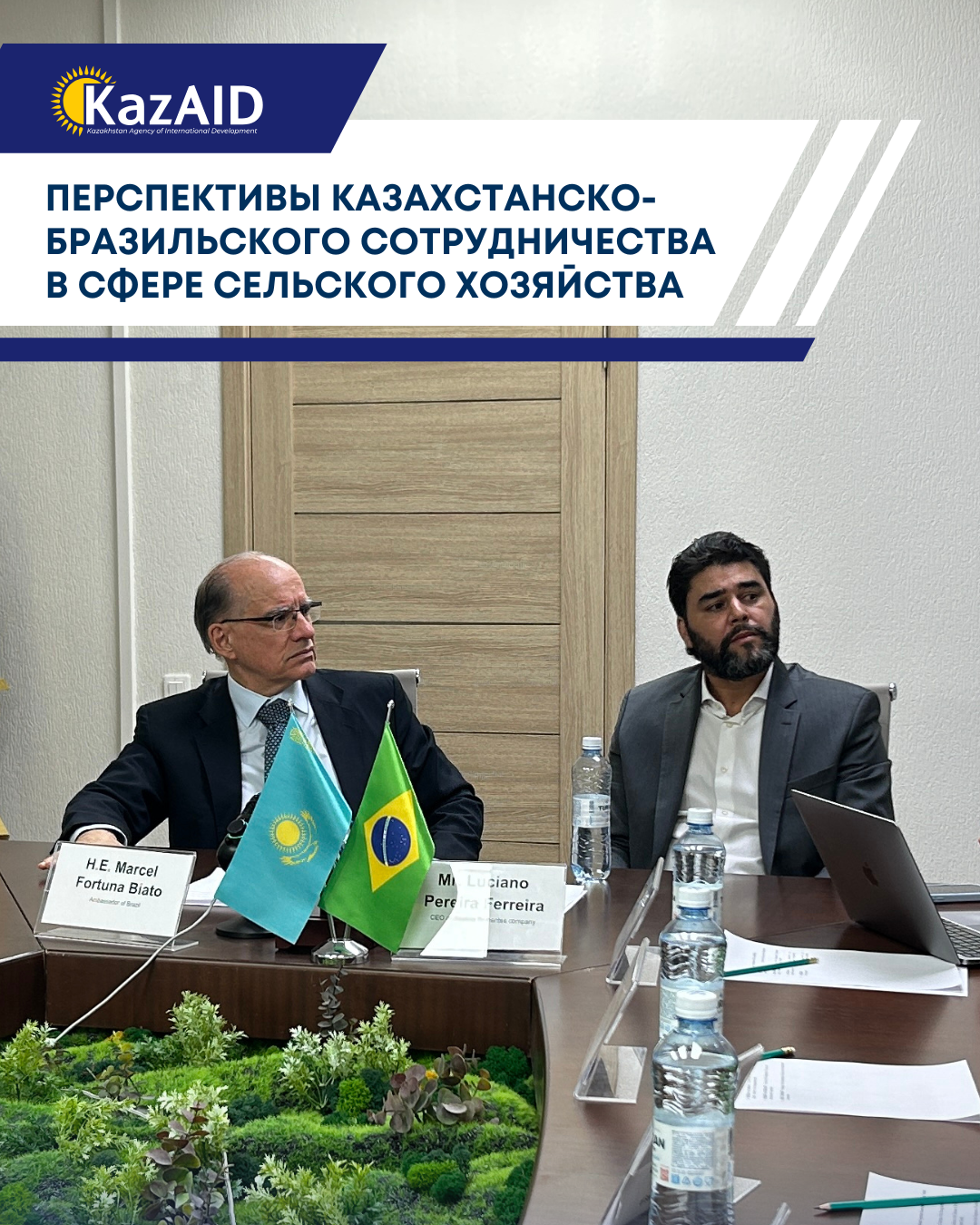 Ауыл шаруашылығы саласындағы Қазақстан мен Бразилия ынтымақтастығының перспективалары2025 жылғы 9 қазан, Астана қаласы - KazAID, Ұлттық аграрлық ғылыми-білім беру орталығы және Бразилияның Sementes Savana компаниясы арасында, Бразилия Елшілігінің қатысуымен кездесу өтті.Кездесуге KazAID төрағасы Аркен Арыстанов, Бразилияның Қазақстандағы елшісі Марсель Фортуна Биато, Sementes Savana компаниясының бас директоры Лусиано Перейра Феррейра және Ұлттық аграрлық ғылыми-білім беру орталығының ғылым жөніндегі төраға орынбасары Максим Сутула қатысты.Тараптар ауыл шаруашылығы саласындағы бірлескен ынтымақтастықтың болашағын, соның ішінде Бразилия мен Қазақстан арасындағы тұрақты әріптестікті көздейтін Sementes Savana жобасы аясындағы мүмкіндіктерді талқылады.Ақпарат көзі : https://www.gov.kz/memleket/entities/kazaid/press/news/details/1083820?lang=kk