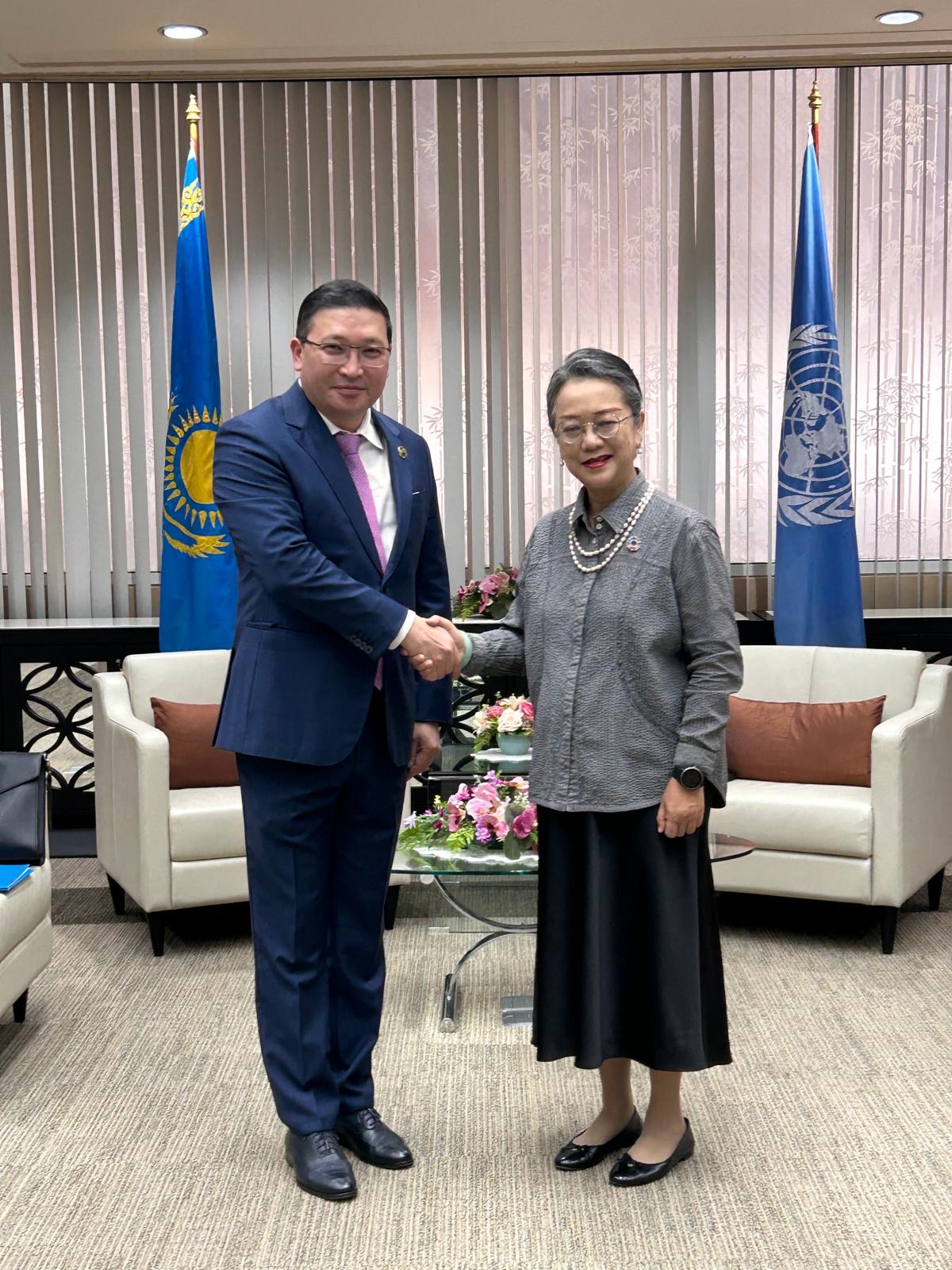 Бангкок, 2025 жылғы 2 қазан –Біріккен Ұлттар Ұйымының Азия және Тынық мұхиты өңіріне арналған Экономикалық және әлеуметтік комиссиясы (АТМЭӘК) жанындағы Қазақстан Республикасының Тұрақты өкілі Марғұлан Баймұхан комиссияның Бангкоктағы штаб-пәтерінде БҰҰ Бас хатшысының орынбасары әрі АТМЭӘК Атқарушы хатшысы Армида Салсия Алисджабанамен кездесті.Кездесу барысында Елші Қазақстан Республикасының Президенті Қасым-Жомарт Тоқаевтың атынан құттықтауын және ізгі тілектерін жеткізді.Сонымен қатар Елші Мемлекет басшысының Нью-Йоркте өткен БҰҰ Бас Ассамблеясының 80 жылдық мерейтойлық сессиясындағы сөйлеген сөзінің негізгі тұстарымен таныстырып, жаһандық бейбітшілік, тұрақты даму, өңірлік ынтымақтастық, ішкі реформалар, жасанды интеллект пен цифрлық шешімдерді енгізу мәселелеріндегі Қазақстанның көзқарасы мен басымдықтарын атап өтті.Тұрақты өкіл Қазақстанның көпжақты ынтымақтастыққа берік бейілділігін және АТМЭӘК-пен үш онжылдықтан астам уақыттан бері орныққан өзара тиімді серіктестіктің тұрақты дамып келе жатқанын атап өтті.Тараптар Орталық Азиядағы өңірлік ынтымақтастық мәселелерін талқылап, Азия-Тынық мұхиты аймағының әлеуметтік-экономикалық дамуы мен интеграциясында өңірдің маңызды рөлін ерекше атап өтті. Қазақстандық дипломат Орталық Азияның Еуропа мен Азияны жалғайтын стратегиялық дәнекер ретіндегі артықшылығын тиімді пайдалануда келісілген күш-жігердің маңыздылығына назар аударды.Сондай-ақ Қазақстанның ұйым шеңберіндегі бастамалары, соның ішінде Алматы қаласында орныққан дамуға арналған АТМЭӘК Цифрлық шешімдер орталығын құру жобасы қарастырылды. Бұл флагмандық бастама цифрлық трансформацияны жеделдетуге, тәжірибе, білім және технологиялар алмасуды ілгерілетуге бағытталған.Елші Қазақстанның АТМЭӘК-ті инклюзивті диалог, консенсус қалыптастыру және әлеуметтік-экономикалық өлшемде өңірлік ынтымақтастық үшін сенімді алаң ретінде қарастыратынын да атап өтті.Жақын болашақтағы жоспарлар ретінде тараптар көлік және логистика, энергетика, қоршаған ортаны қорғау, сауданы ілгерілету және әсіресе Орталық Азия үшін өзекті болып отырған су ресурстарын тұрақты басқару бағыттары бойынша ынтымақтастықты кеңейту ниетін атап өтті.Кездесу қорытындысында қазақстандық дипломат Қазақстанның АТМЭӘК-тің Азия-Тынық мұхиты өңірінде тұрақты әрі инклюзивті дамуды ілгерілету жөніндегі жұмысына елеулі үлес қосуға бейілділігін тағы да растады.Ақпарат көзі : https://www.gov.kz/memleket/entities/mfa-thailand/press/news/details/1079468?lang=kk