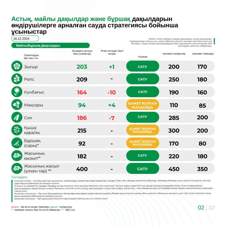 Астық, майлы дақылдар және бұршақ дақылдарын өндірушілерге арналған сауда стратегиясы бойынша ұсыныстар 16.12.2024 24.12.2024
